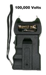 Features: 100k volt output; safety switch; belt clip; attached wrist strap; compact size for pocket or belt carry; requires one 9-volt battery (not included)