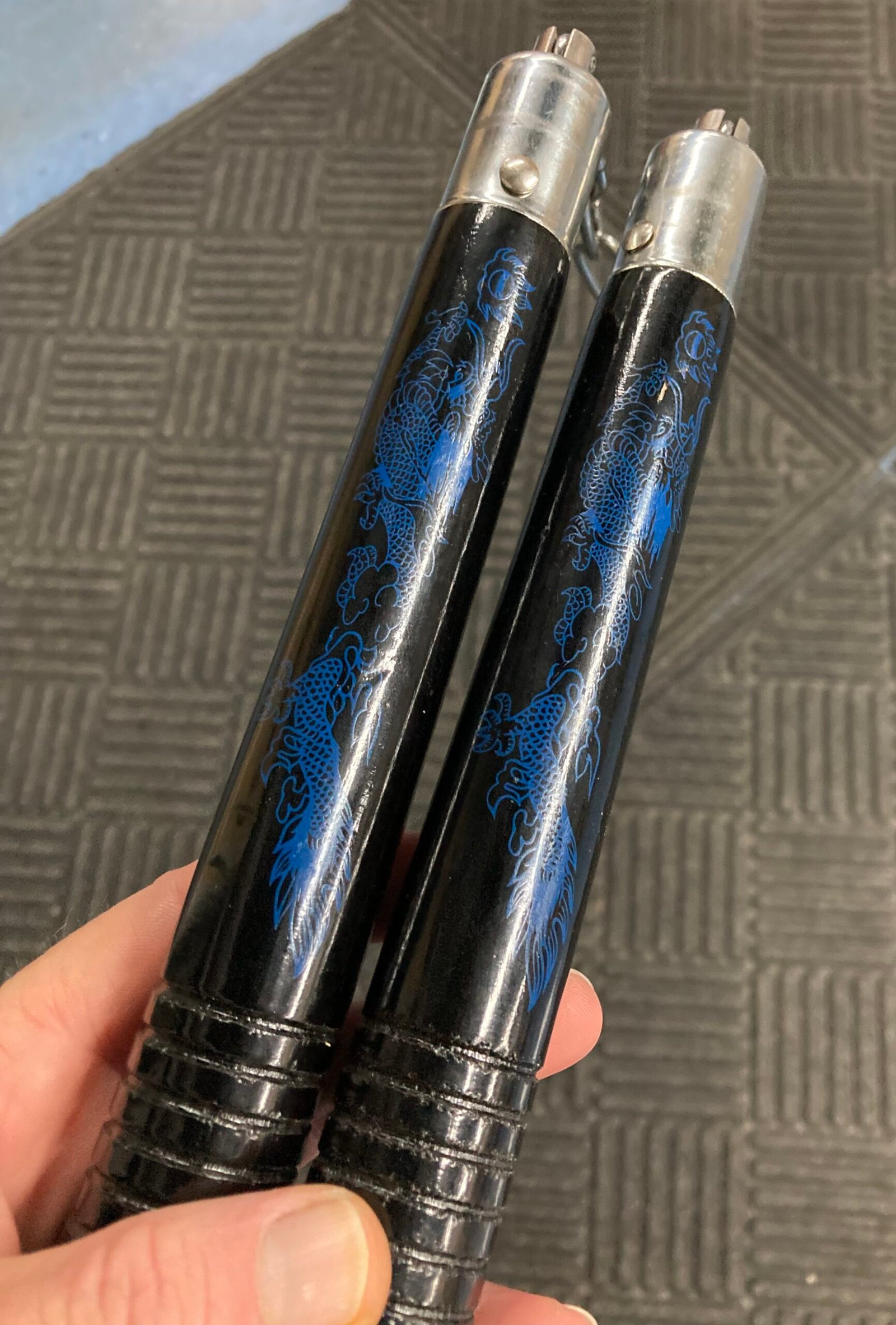 The handles are connected by a 5-1/2″ chain equipped with smooth ball-bearing swivels designed to support fast rotations and tight directional changes. The blue dragon designs contrast sharply against the glossy black surface, creating a clean, traditional martial arts aesthetic suitable for training or display.