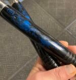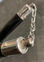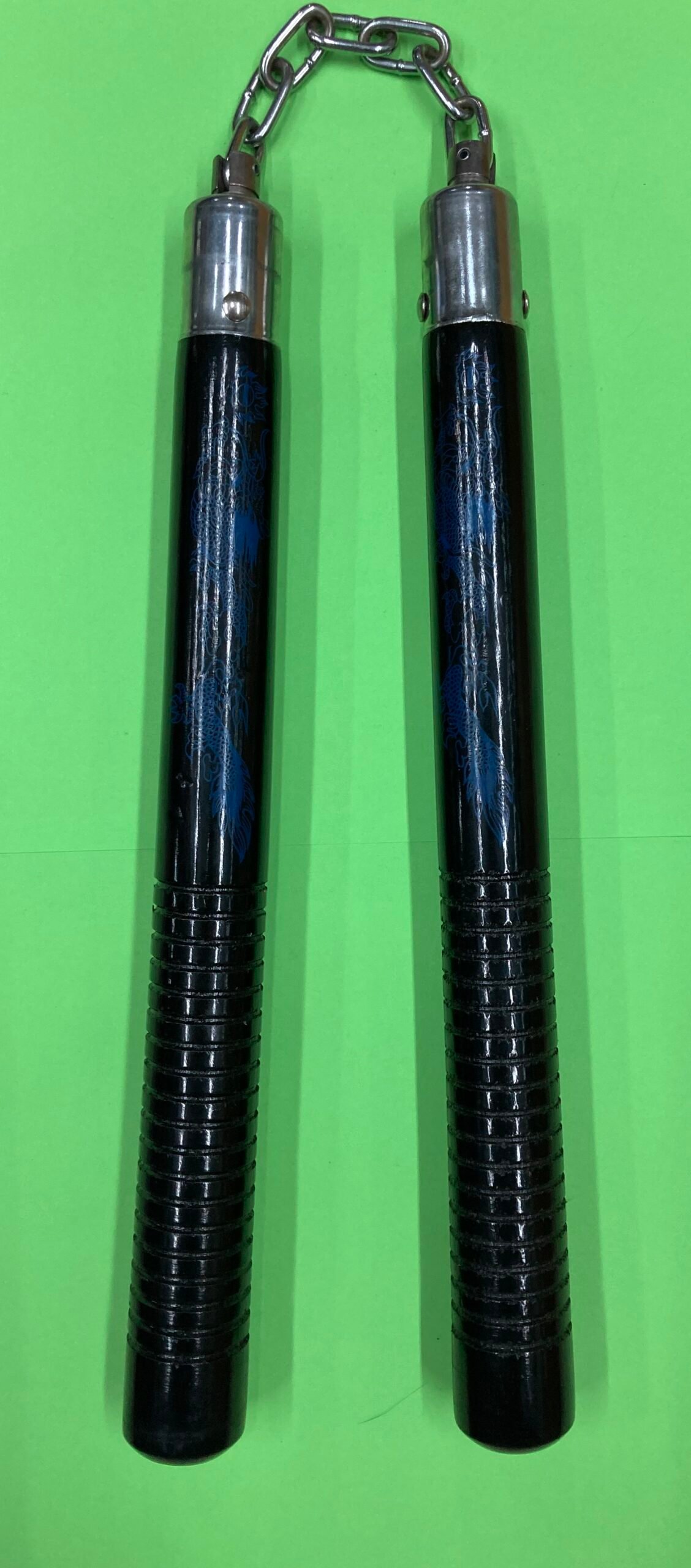 12″ hardwood nunchaku with glossy black finish, blue dragon artwork, circular grip grooves, and ball-bearing swivel chain. Approx. 14.7 oz with 5-1/2″ chain. Ideal for martial arts training, practice, and collection.