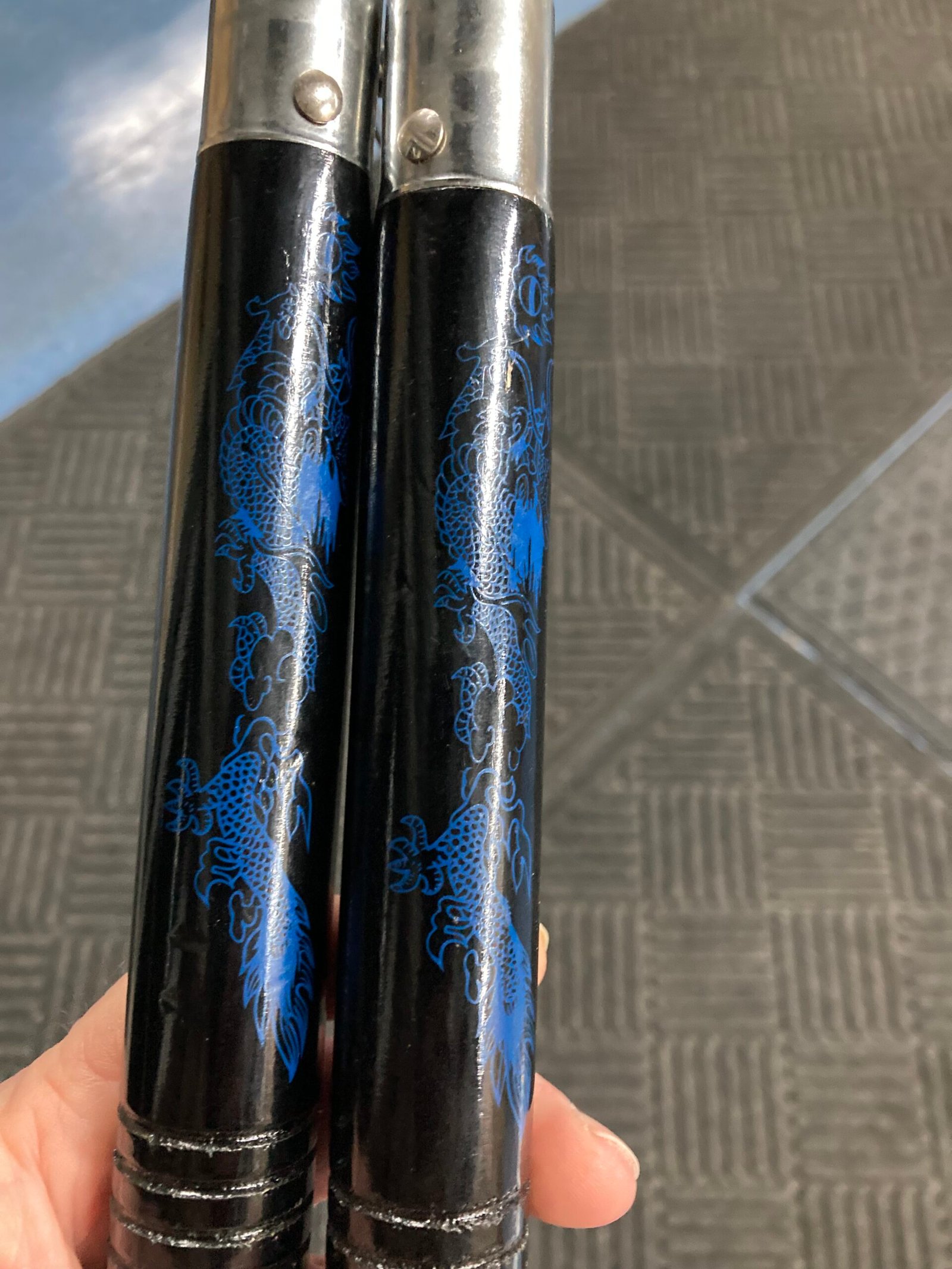 This pair of 12″ Round Wood Blue Dragon Nunchaku delivers solid hardwood construction with a glossy black finish and detailed blue dragon artwork on each handle. Circular grip grooves provide a secure, comfortable hold during spins and transitions, giving you better control for training, freestyle movement, or martial arts practice.