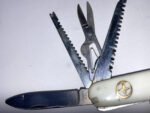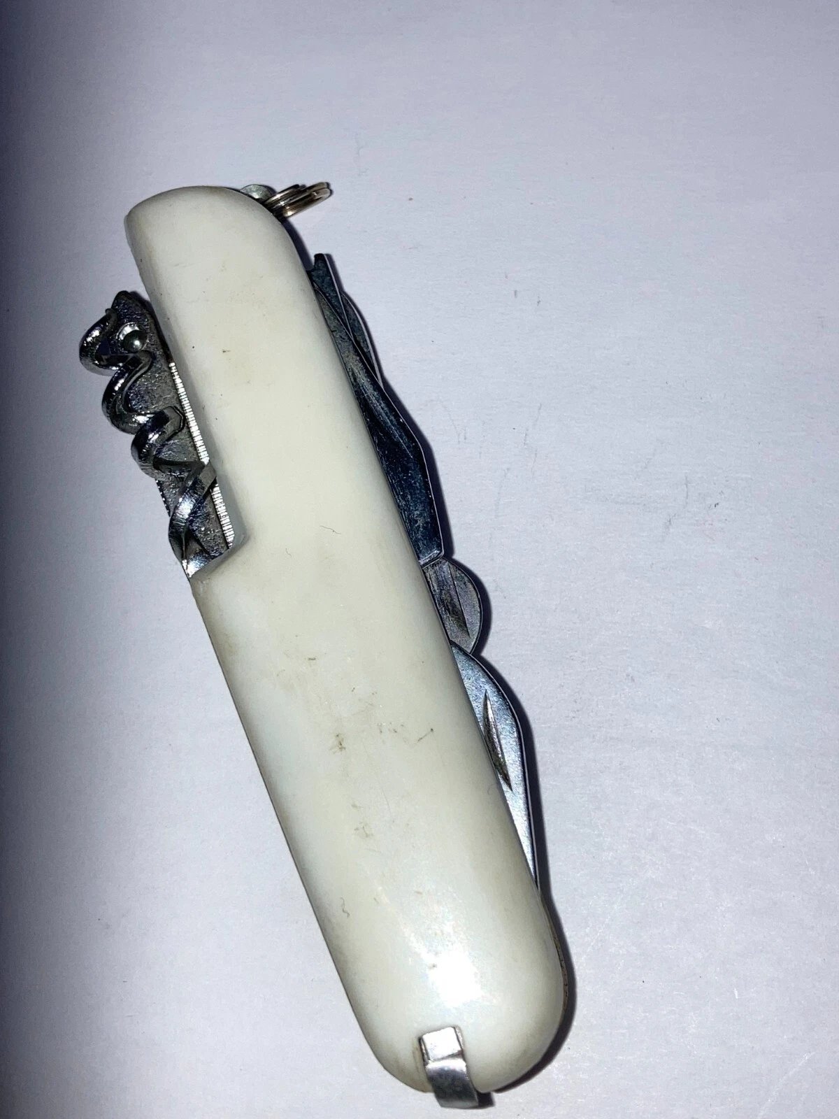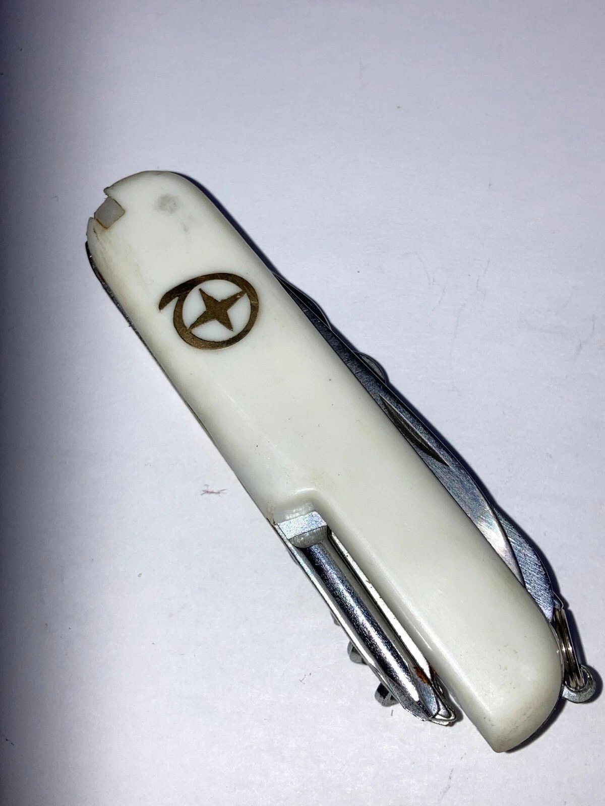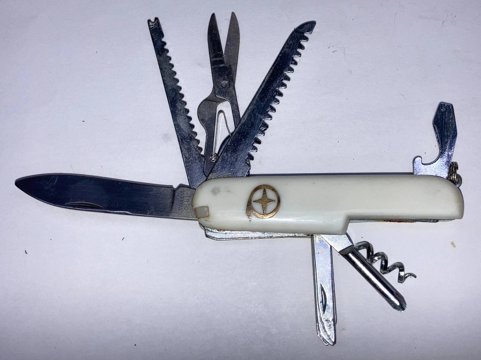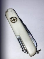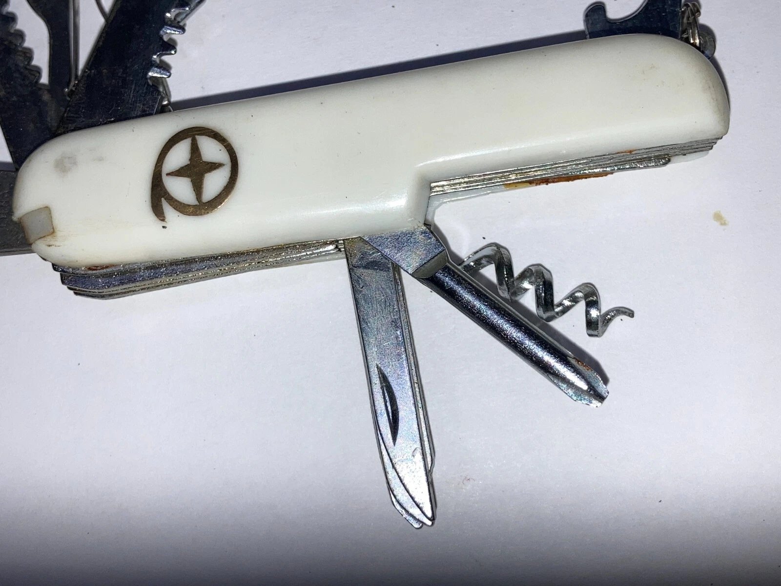 13-FUNCTION WHITE CAMPING KNIFE – MODEL K-5011 (DEALER NEW OLD STOCK, CIRCA 1998) Condition: Dealer New Old Stock (NOS). Stored for over 25 years; never used.