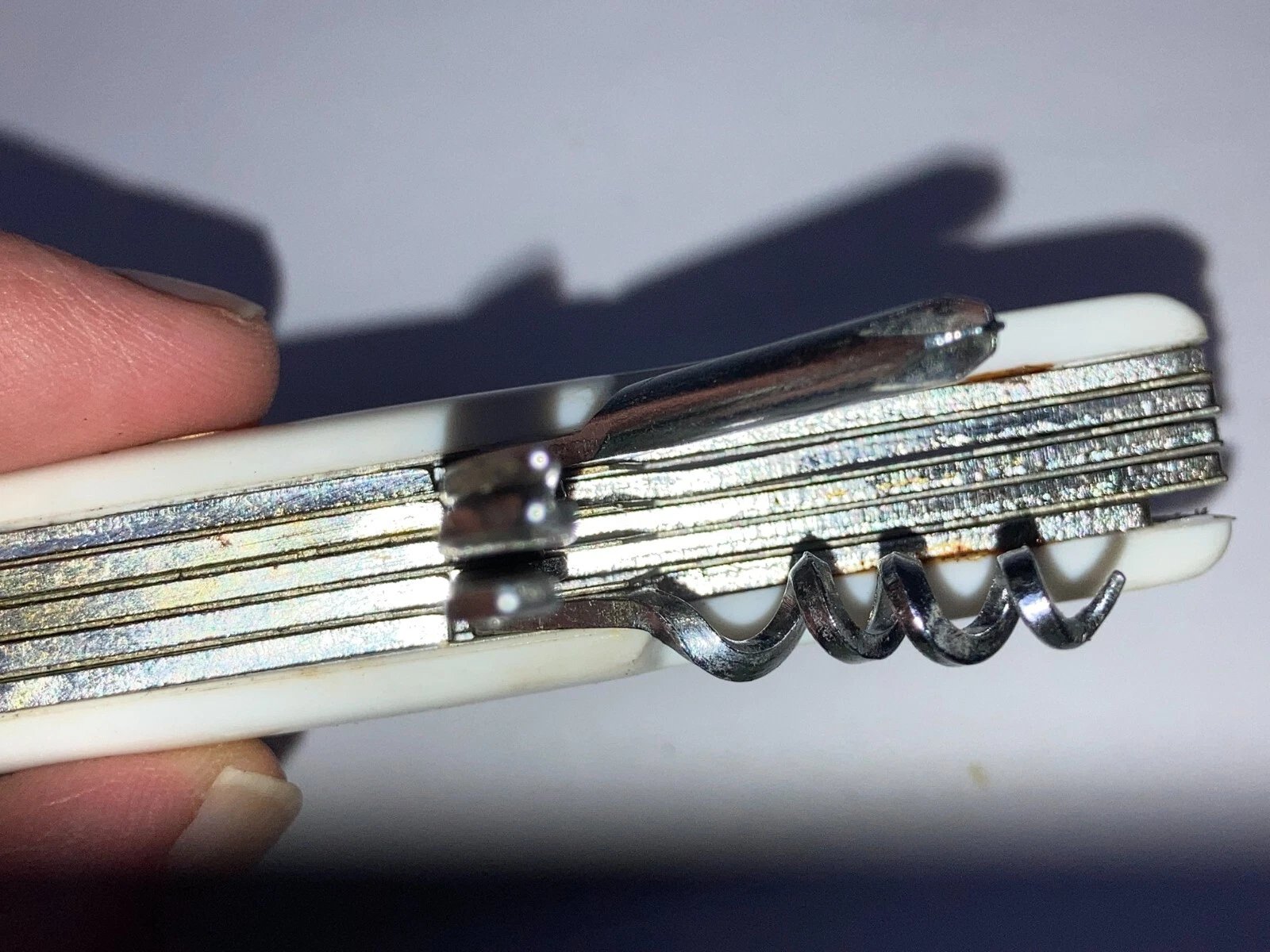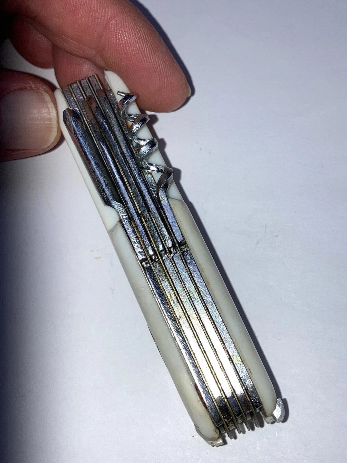 Condition: Dealer New Old Stock (NOS). Stored for over 25 years; never used. Not in original packaging. Some knives may have price tags. White handles may show more visible blemishes and discoloration than red or black models due to material aging. Tweezers and toothpick may be missing or nonfunctional.