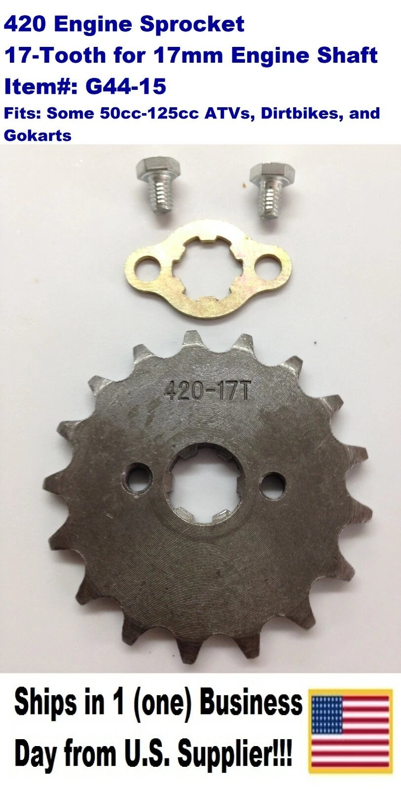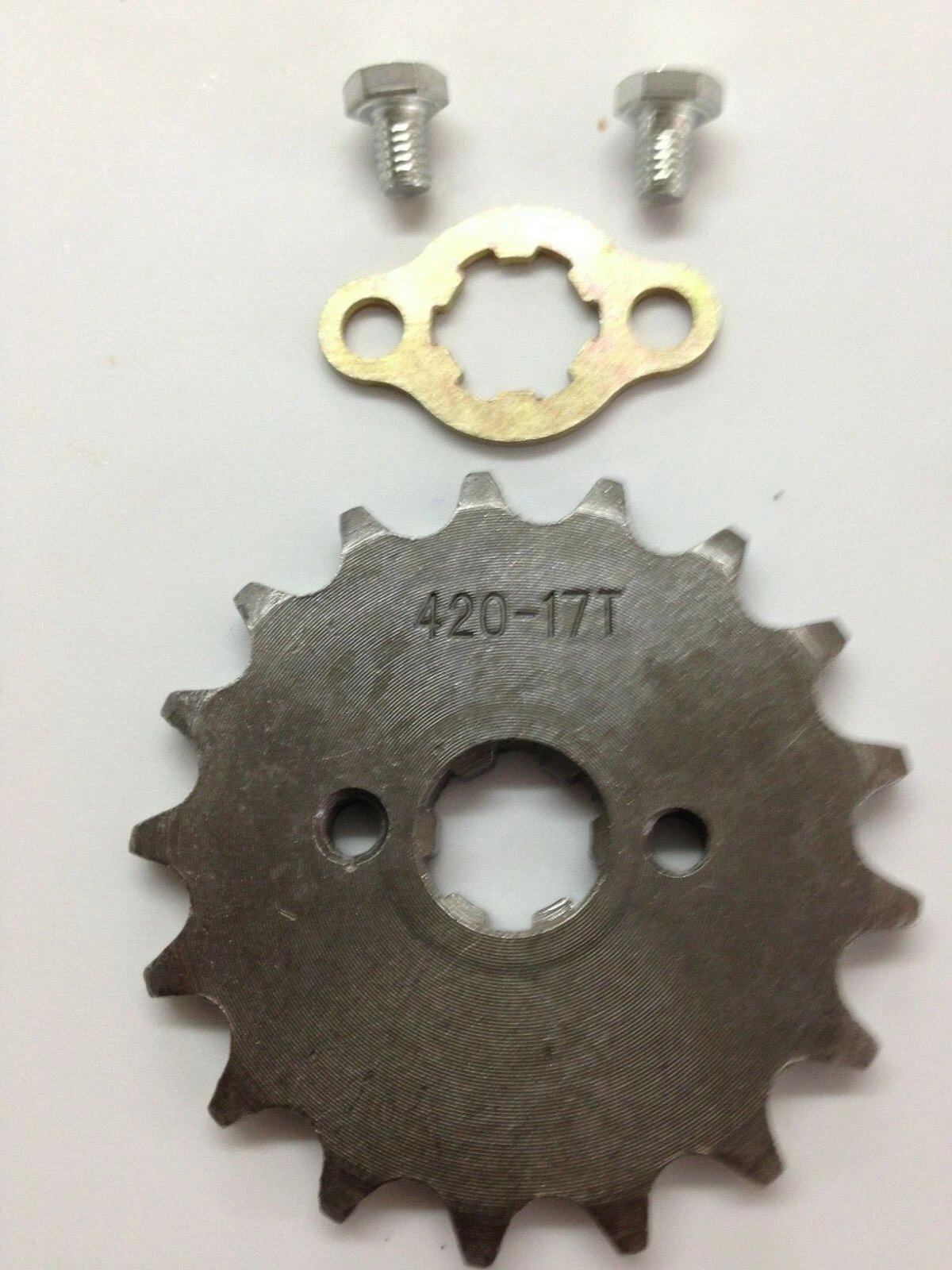 420 ENGINE SPROCKET – 17 TOOTH – FOR 17mm ENGINE SHAFT – G44-15 Condition: New Collectible: No Manufacturer: Unknown Country of Manufacture: China Item Number: G44-15 Description: Engine front sprocket for 420 chain size, 17 teeth, designed