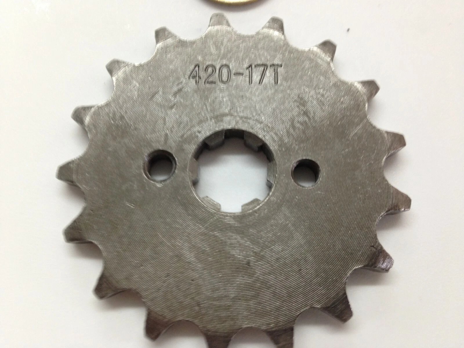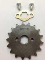 Engine front sprocket for 420 chain size, 17 teeth, designed for engines with a 17mm output shaft. Suitable for many 50cc–125cc ATVs, dirtbikes, and gokarts.