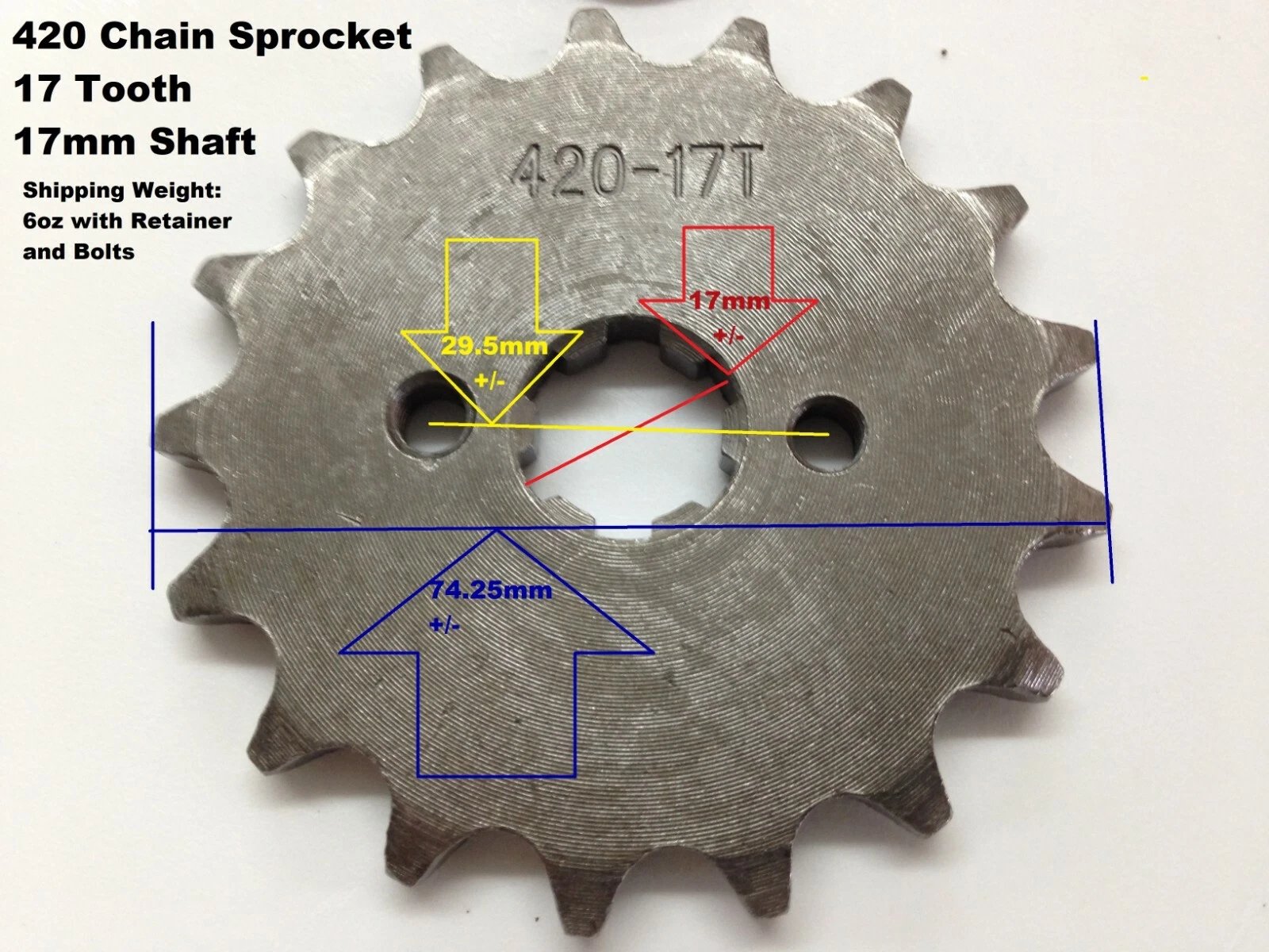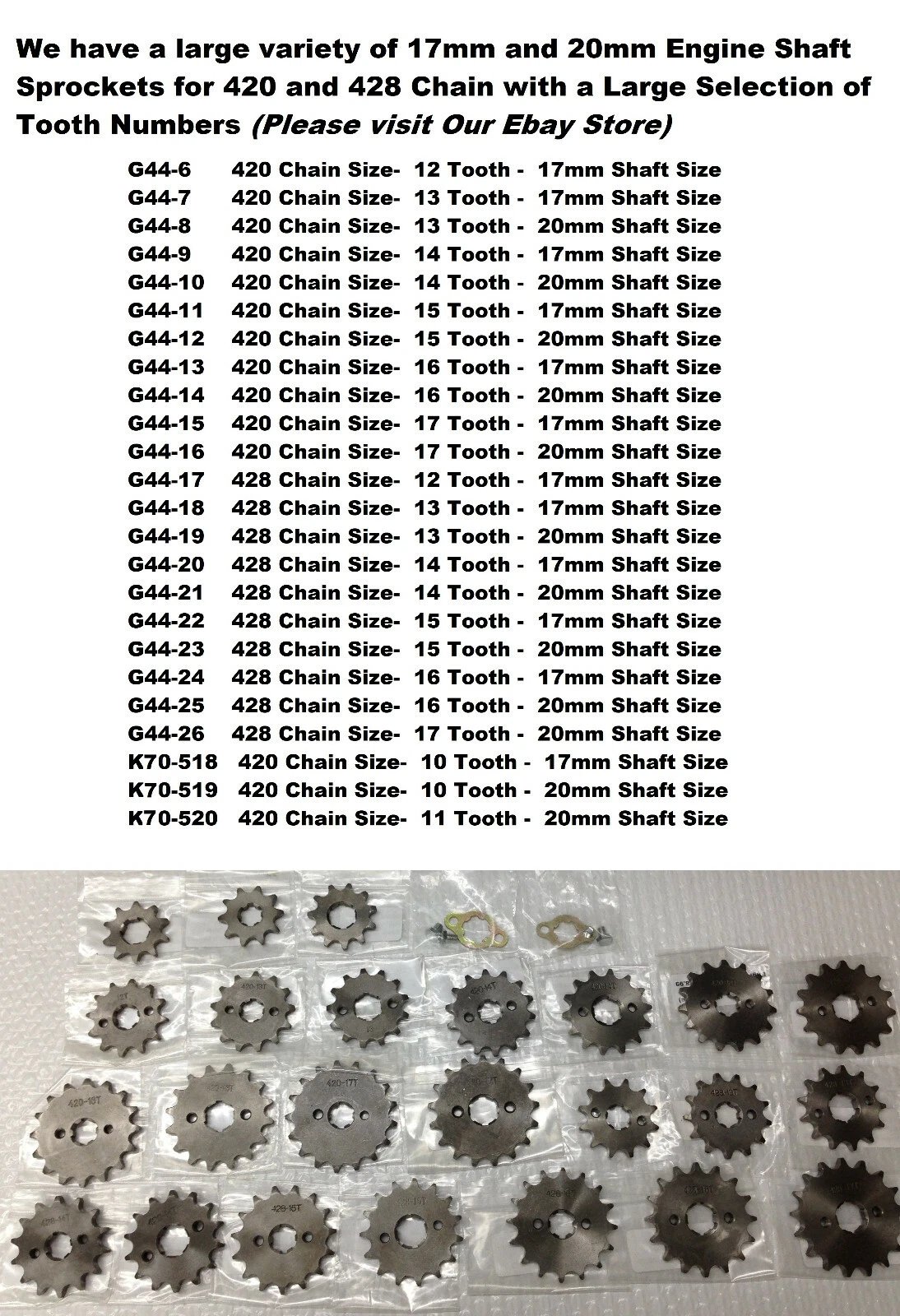 Before ordering, confirm your chain size (usually marked on the side of your chain or existing sprocket) and engine shaft size (17mm or 20mm). Verify the bolt pattern and measurements shown in the pictures.