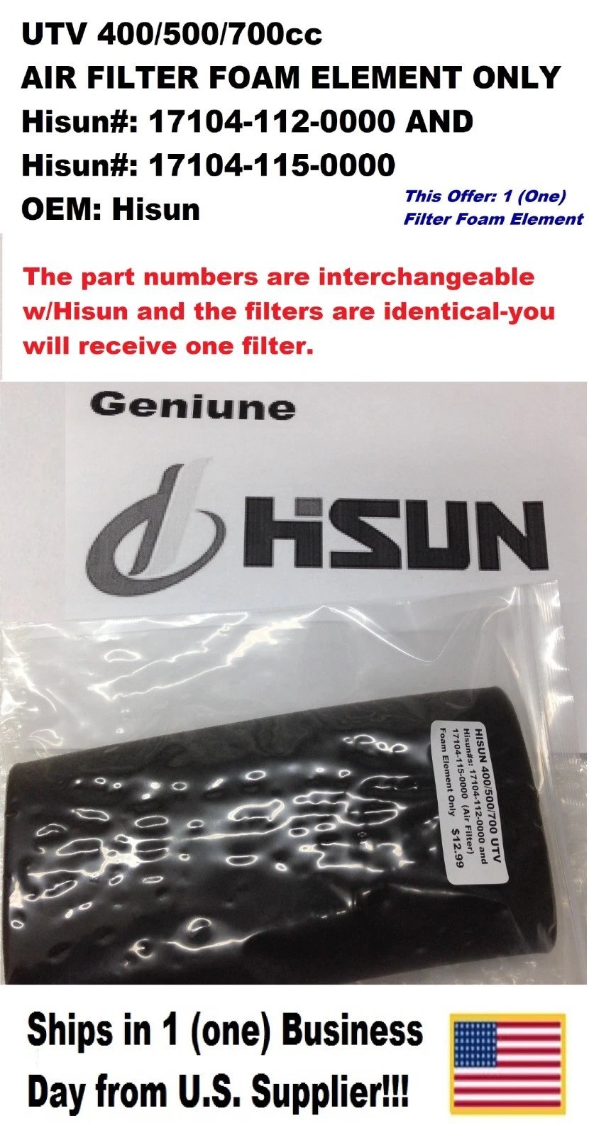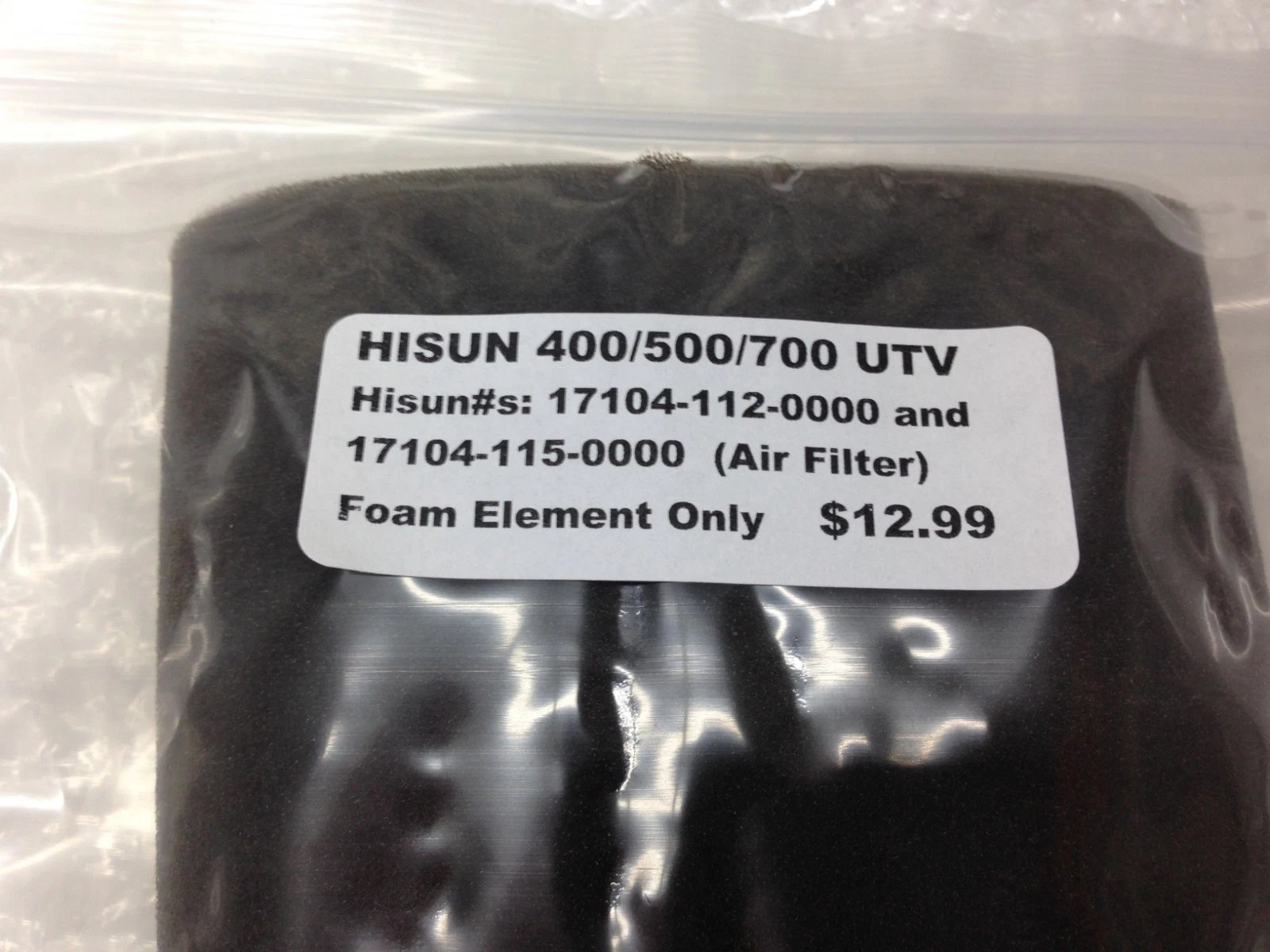 AIR FILTER FOAM ELEMENT FOR UTV 400/500/700 Condition: New MPN / Item Number: 17104-112-0000, 17104-115-0000 UPC: Unknown Country of Manufacture: Unknown Manufacturer: Hisun OEM Part Number: 17104-112-0000, 17104-115-0000 Description: OEM r