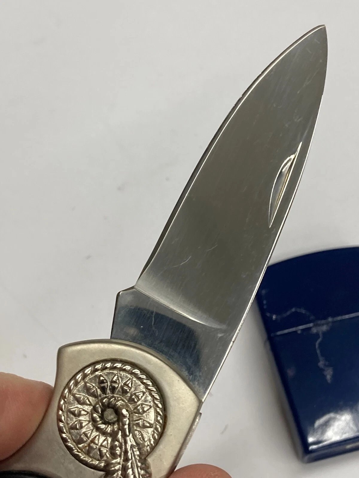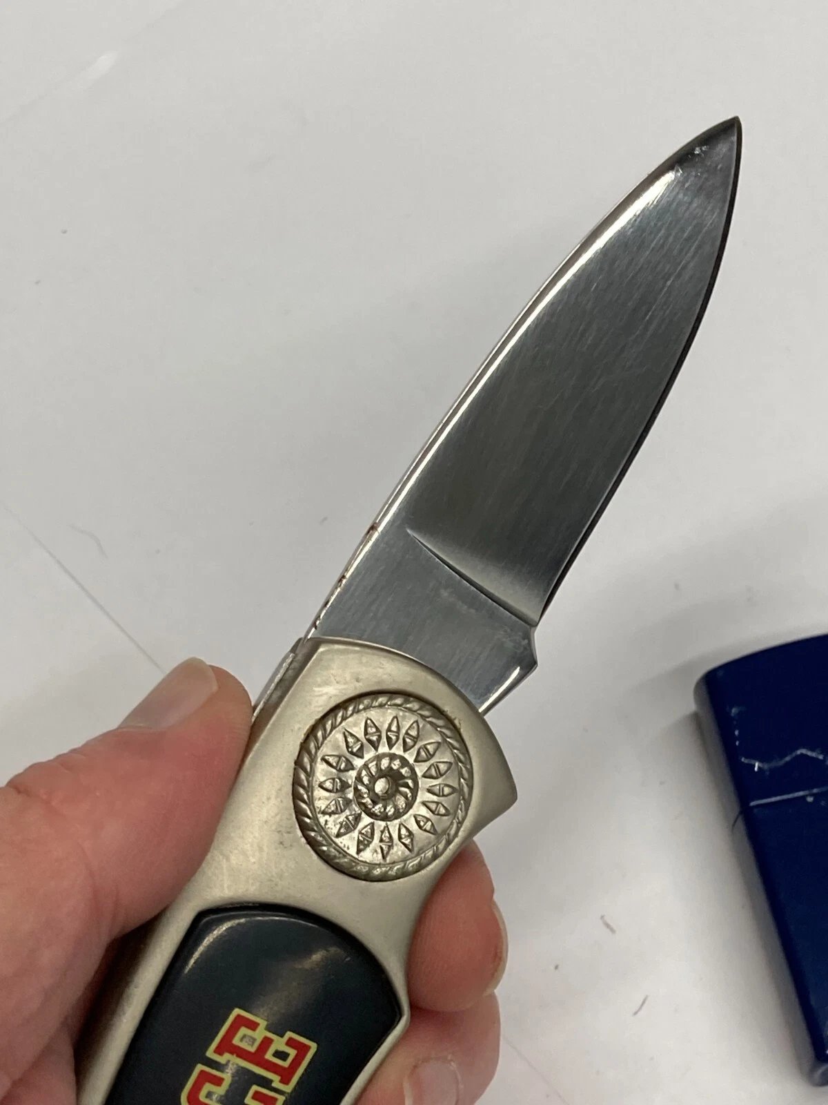Special Note: This item is discounted. Handles show aging and blemishes from storage. The lighter has a manufacturing blemish on the rear paint surface. The presentation box also shows some finish imperfections. Lockback function does not automatically engage when the blade is fully opened; it must be pressed manually to lock. Please review photos closely for overall condition.