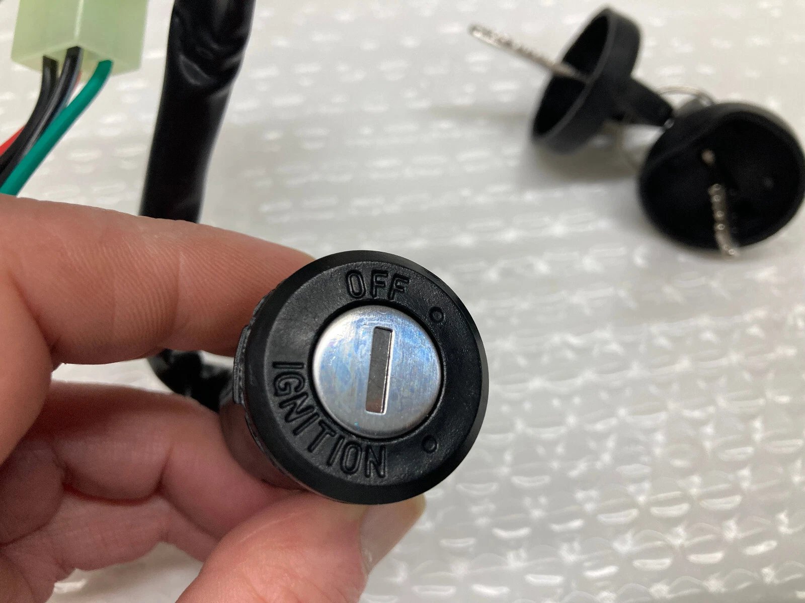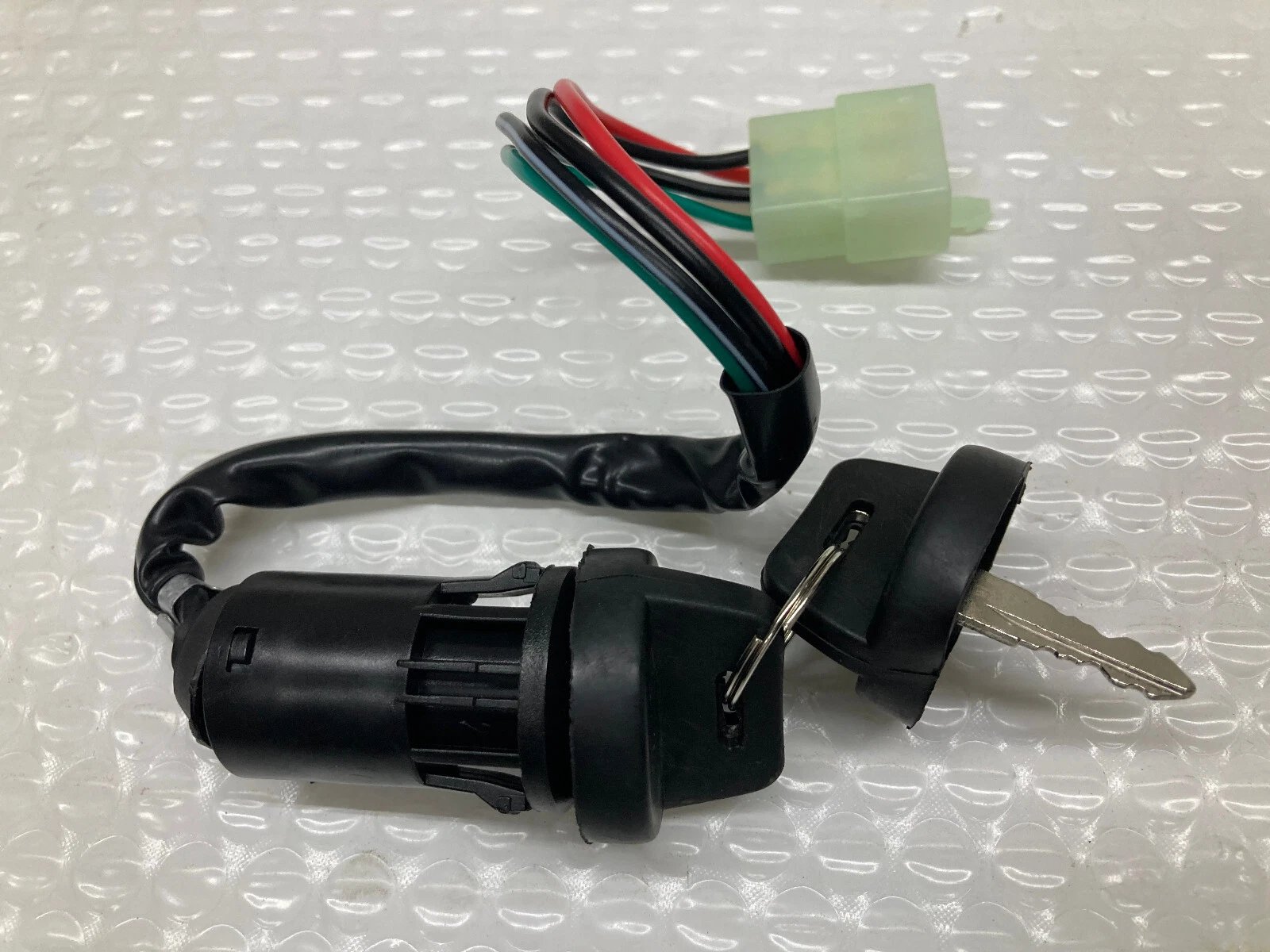 4-wire, 4-pin ignition switch assembly with large white male connector. Designed for various ATV models using similar connector styles. Includes two (2) identical keys. Each unit is tested and sealed before shipping.