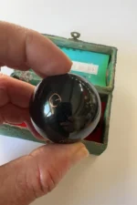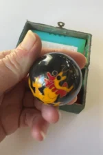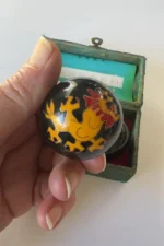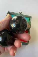 Black Set Rooster Designs Green Box – Chinese Baoding Balls set featuring black balls with rooster design in a green rectangle with closable lid. Dual high and low tone chimes. Approx. 1-7/10 inch diameter balls, Approx. 2.5 to 2.9 oz each. Ideal for hand exercise, stress relief, and display.