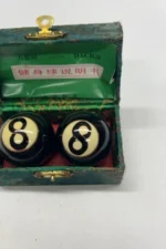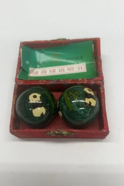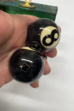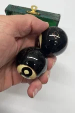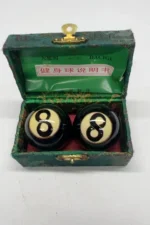 Black Set with Double 8 Green Box – Chinese Baoding Balls set featuring black balls with double 8 design in a green rectangle with closable lid. Dual high and low tone chimes. Approx. 1-7/10 inch diameter balls, Approx. 2.5 to 2.9 oz each. Ideal for hand exercise, stress relief, and display.