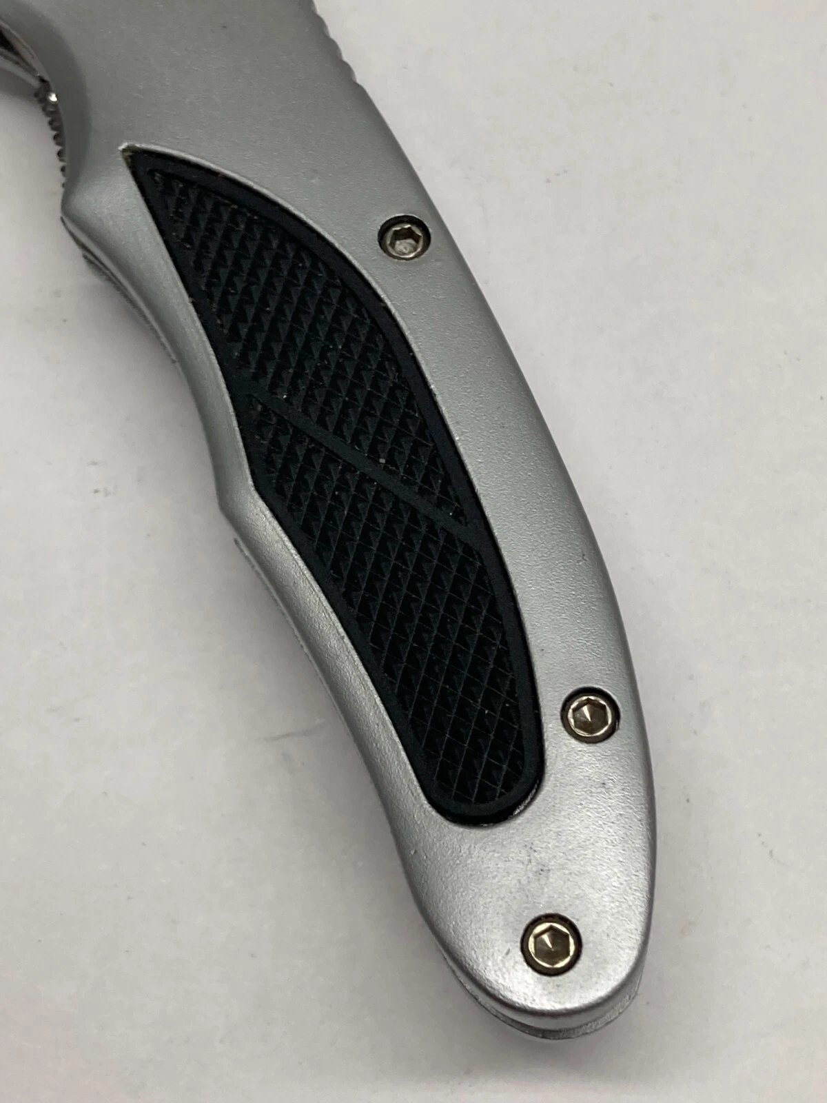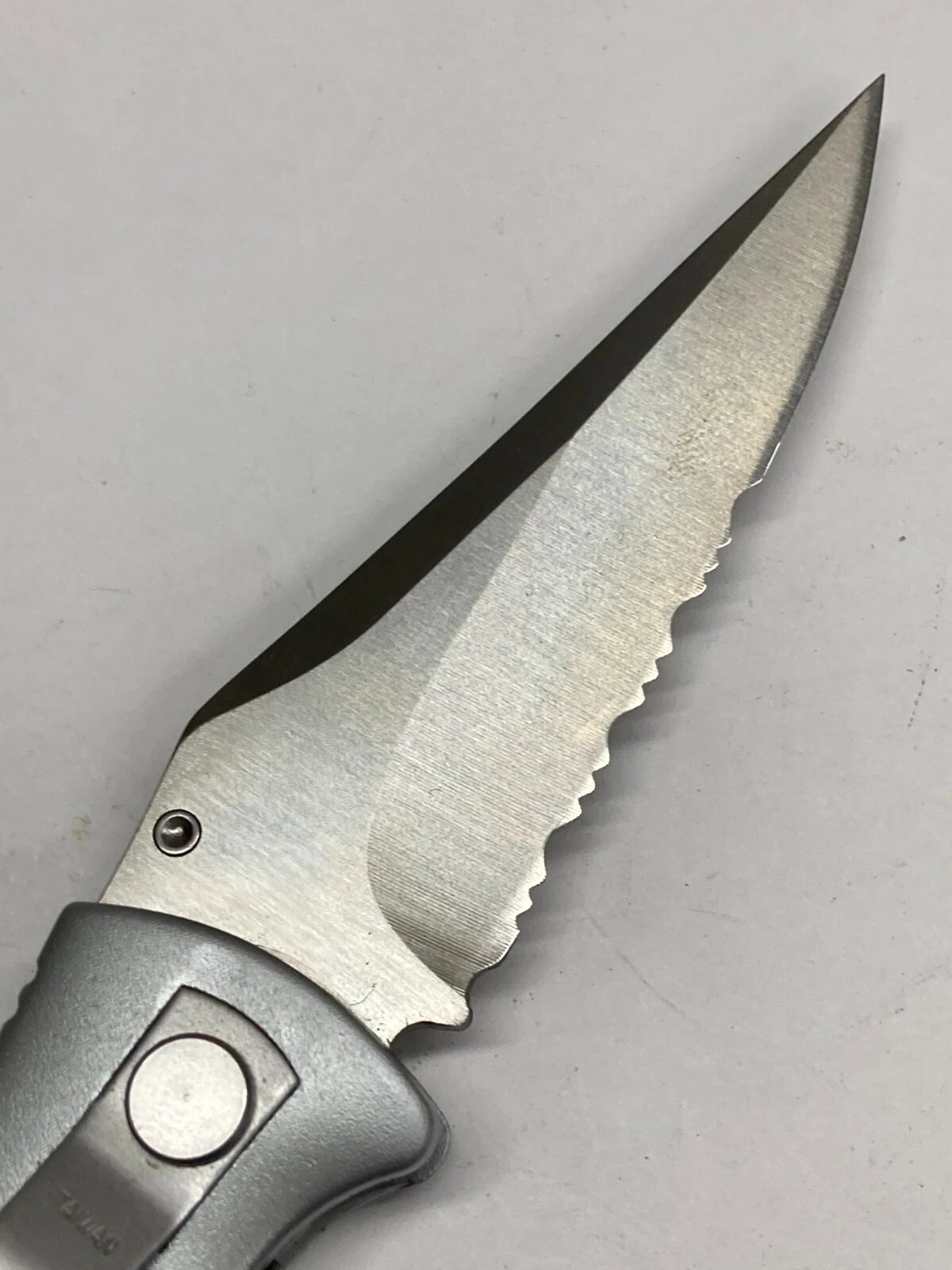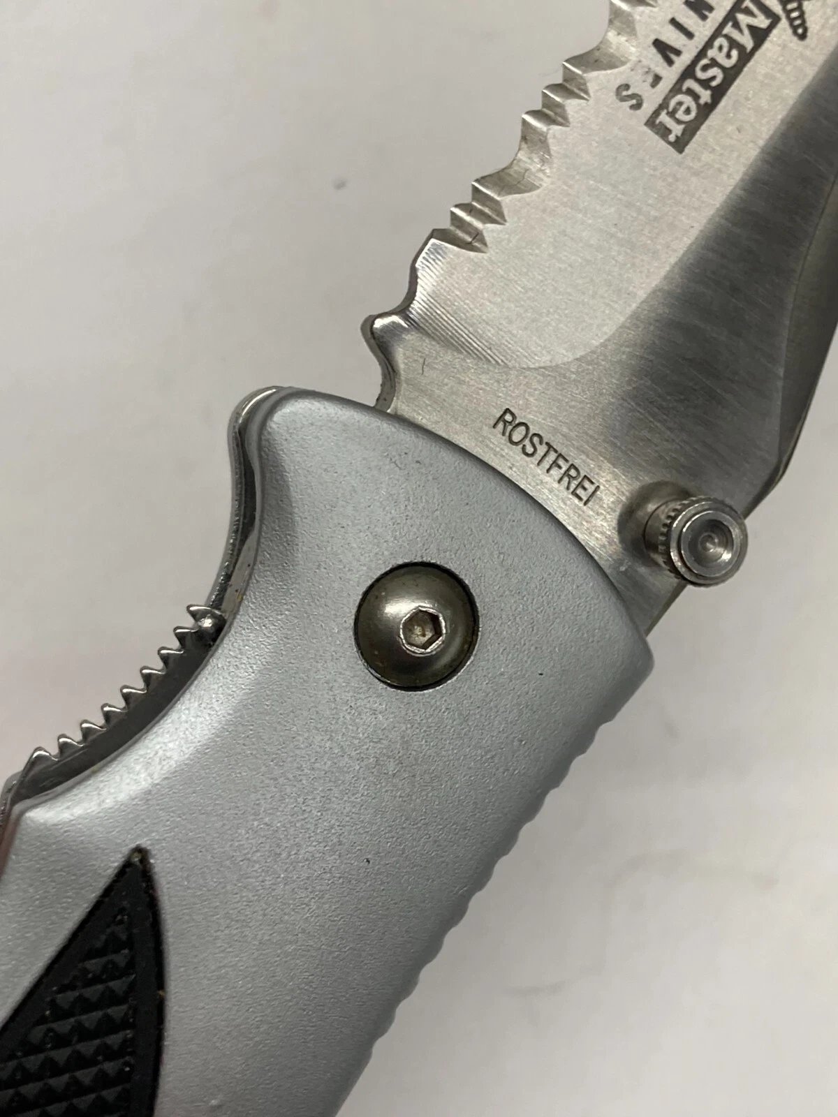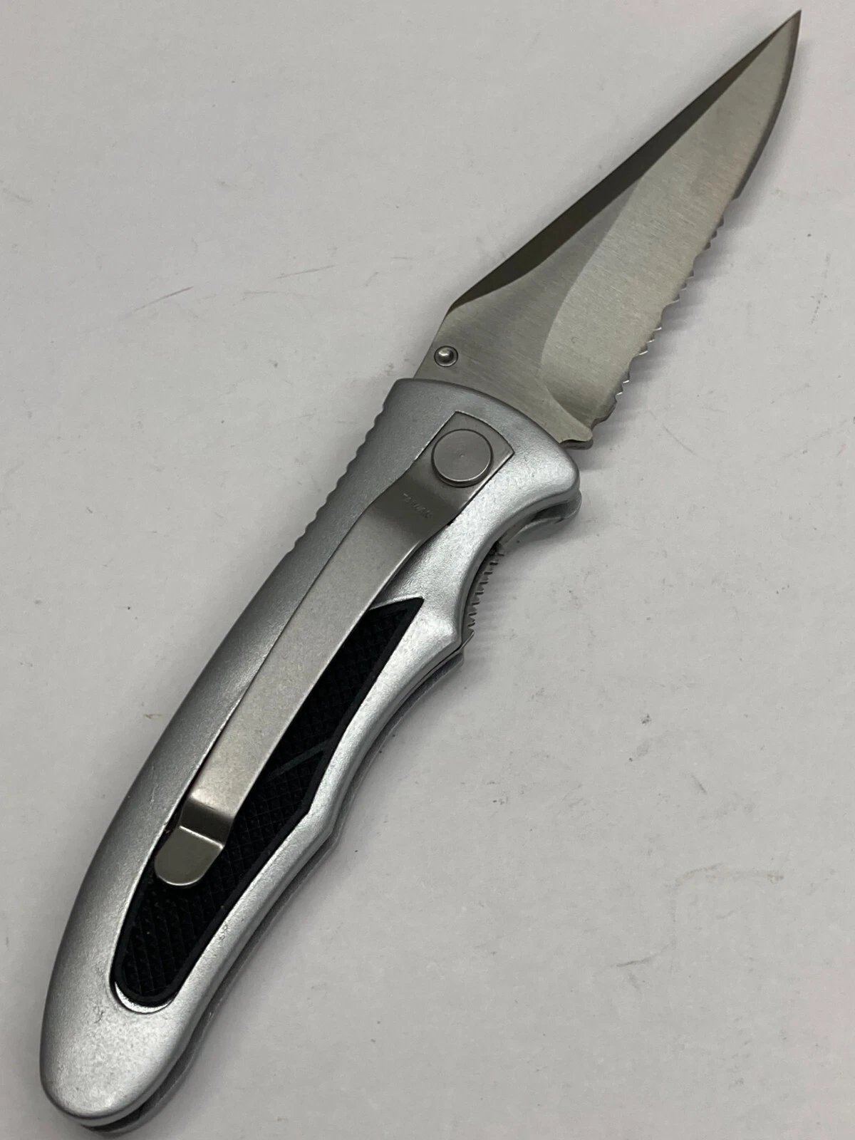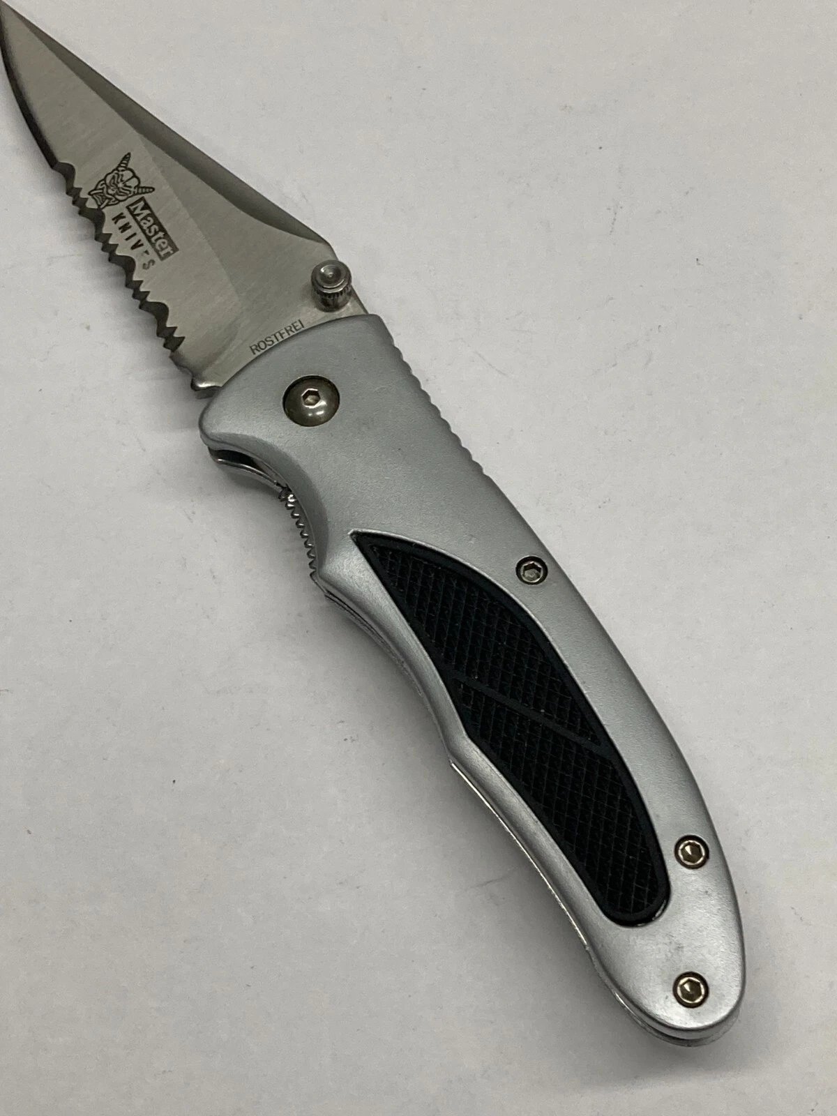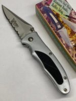 BLACK/SILVER FOLDING KNIFE / COMBO POINT BLADE, THUMB SWITCH, LINER LOCK K-7228 Condition: New (Dealer Old Stock – NOS) Brand / Manufacturer: Master Model Number: K-7228 Country of Manufacture: Taiwan UPC: NA Stored for over 25 years and ne