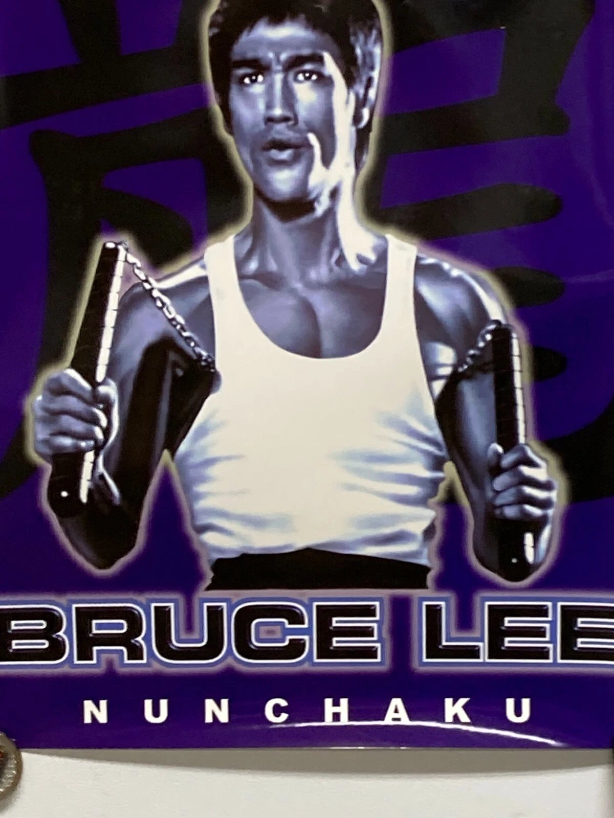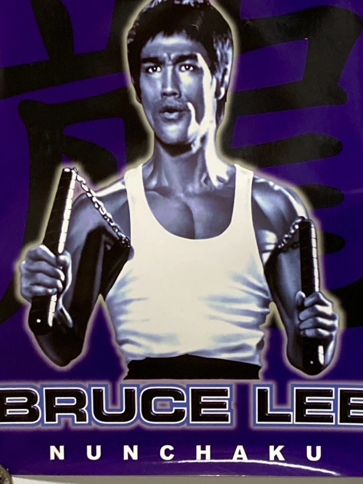 BRUCE LEE POSTER PRINT #BL-020 “PURPLE BACKGROUND NUNCHAKUS” – ROLLED PRINT ONLY (NO FRAME) – NOS Condition: New, Dealer Old Stock. May show mild discoloration on the rear, light crinkling along edges, or handwritten numbers/marks from long