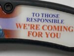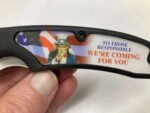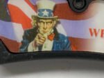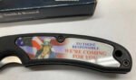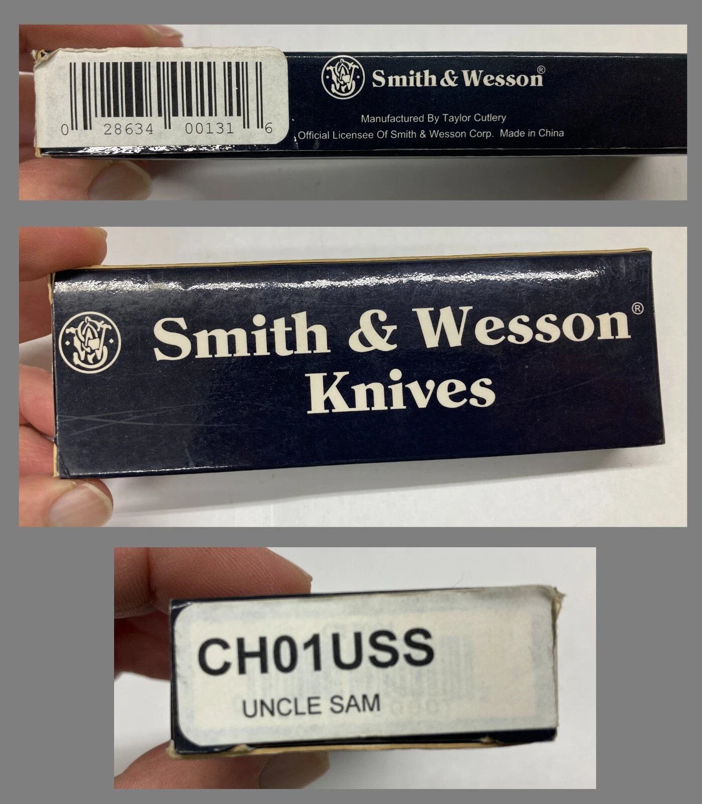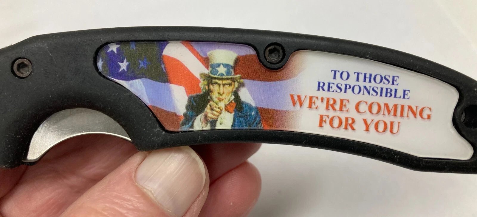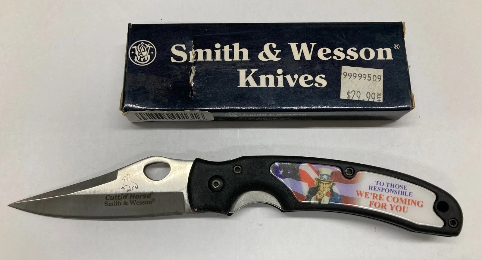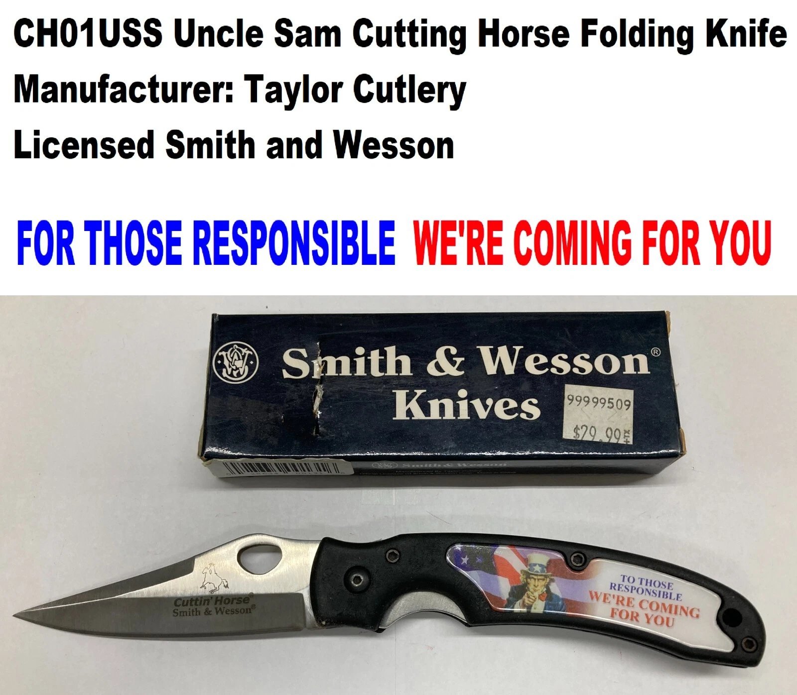 Vintage Taylor Cutlery CH01USS Cutting Horse folding knife featuring the Smith & Wesson–licensed “Uncle Sam” theme, engraved with *“TO THOSE RESPONSIBLE WE’RE COMING FOR YOU.”* Produced circa 1998, this collectible knife was part of dealer old stock stored untouched for over two decades. Noted for its solid hammer-forged surgical steel blade and liner lock design, it’s both a functional knife and a piece of historical memorabilia.