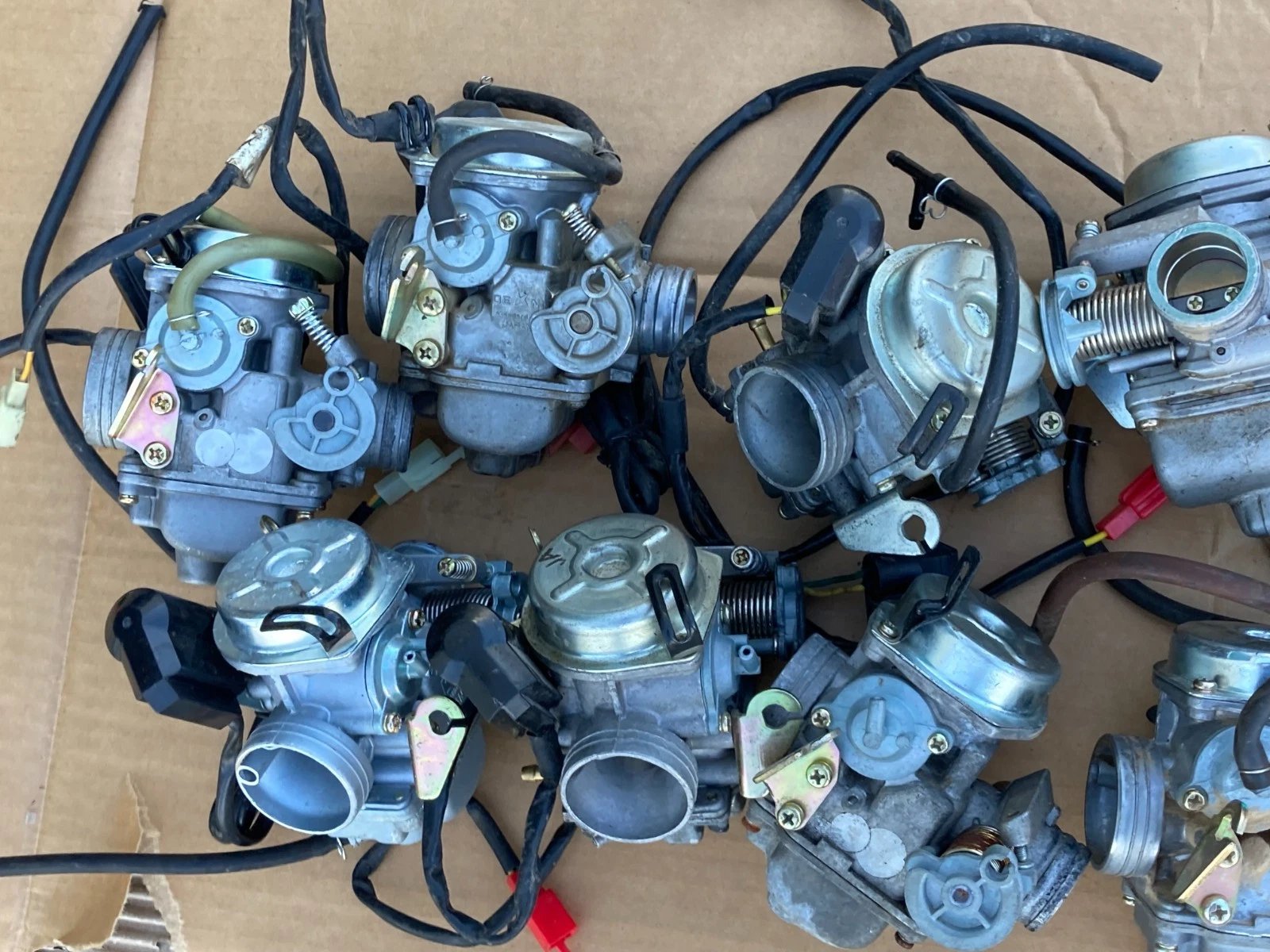 This lot includes a group of used carburetors pulled during repair jobs. They are non-functioning and uncleaned. Most are PD24J 24mm Chinese carburetors with electric choke, typically used for 150cc GY6 engines. Some may vary slightly in configuration or design.