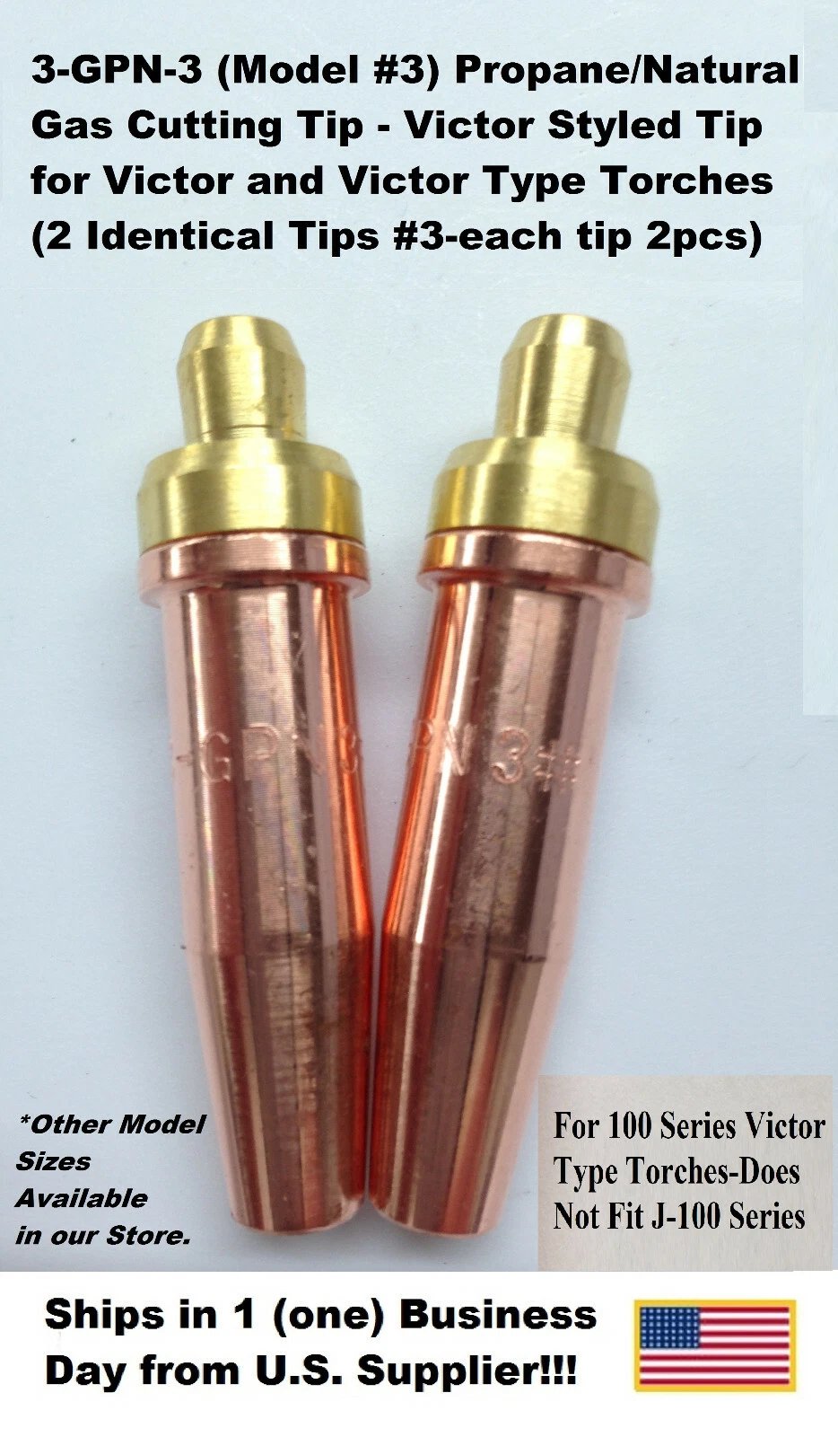 PROPANE / NATURAL GAS CUTTING TIP – 3-GPN – SIZE #3 – FOR VICTOR TYPE TORCH (2-PIECE STYLE) – 2-TIP PACK Condition: New MPN / Item Number: 3-GPN-3 UPC: Unknown Country of Manufacture: China Manufacturer: Unknown Description: Premium-quality