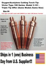 OXYGEN / ACETYLENE CUTTING TORCH TIPS – VICTOR TYPE 100 SERIES – 3-101 – #4 – SET OF 3 TIPS Condition: Dealer New Old Stock (NOS) MPN / Item Number: 3-101-#4 UPC: Unknown Country of Manufacture: China Manufacturer: Unknown Description: Set