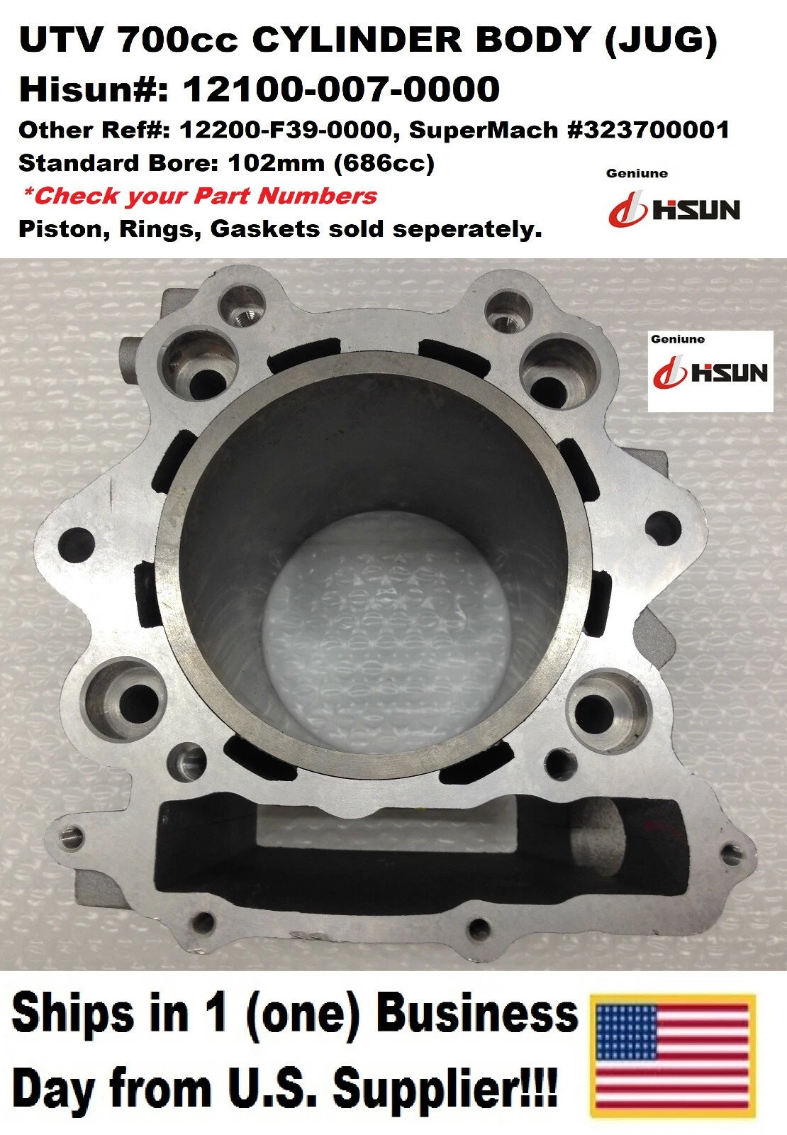 HISUN 700CC UTV CYLINDER BODY (JUG) – 12100-007-0000 Condition: New Part Numbers: 12100-007-0000, 12200-F39-0000, SuperMach 323700001 Product Description: Factory OEM cylinder body (jug) for Hisun 700cc UTV engines. Designed for both EFI an