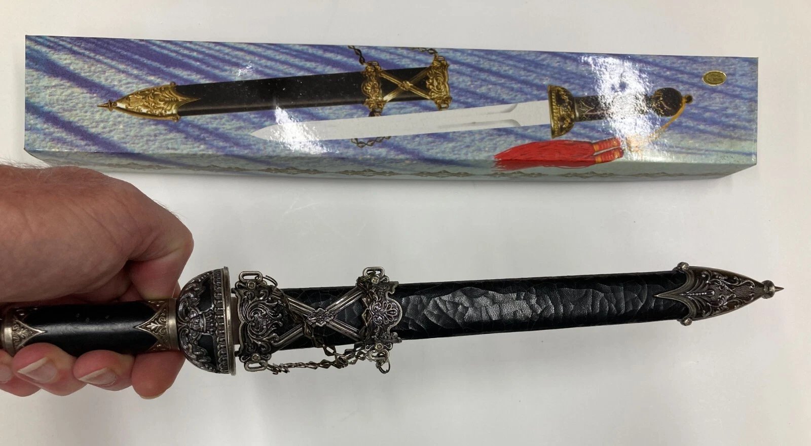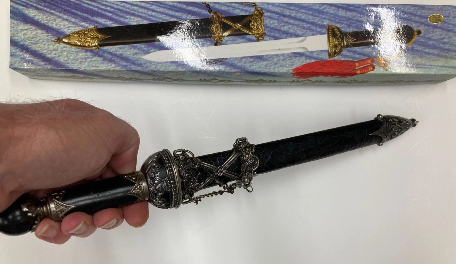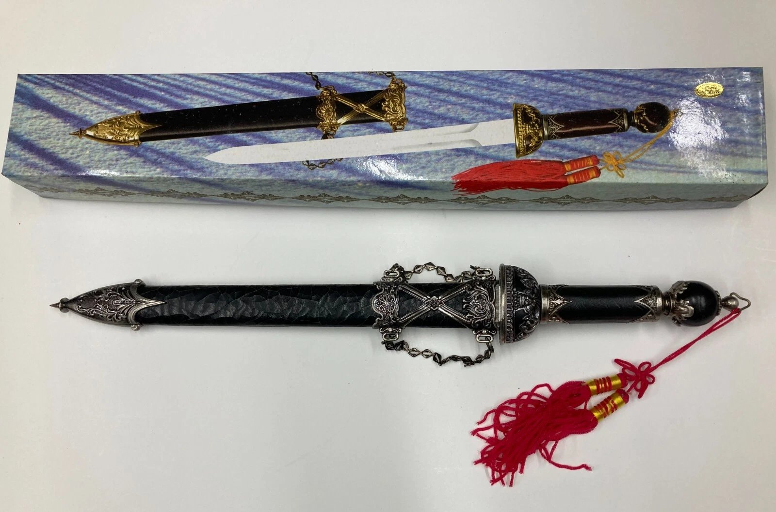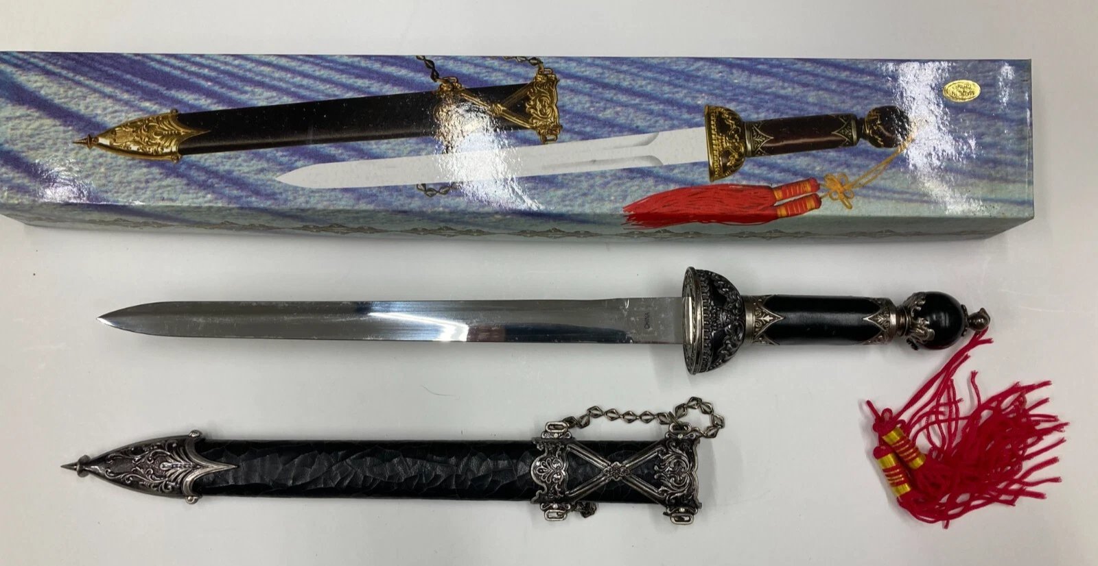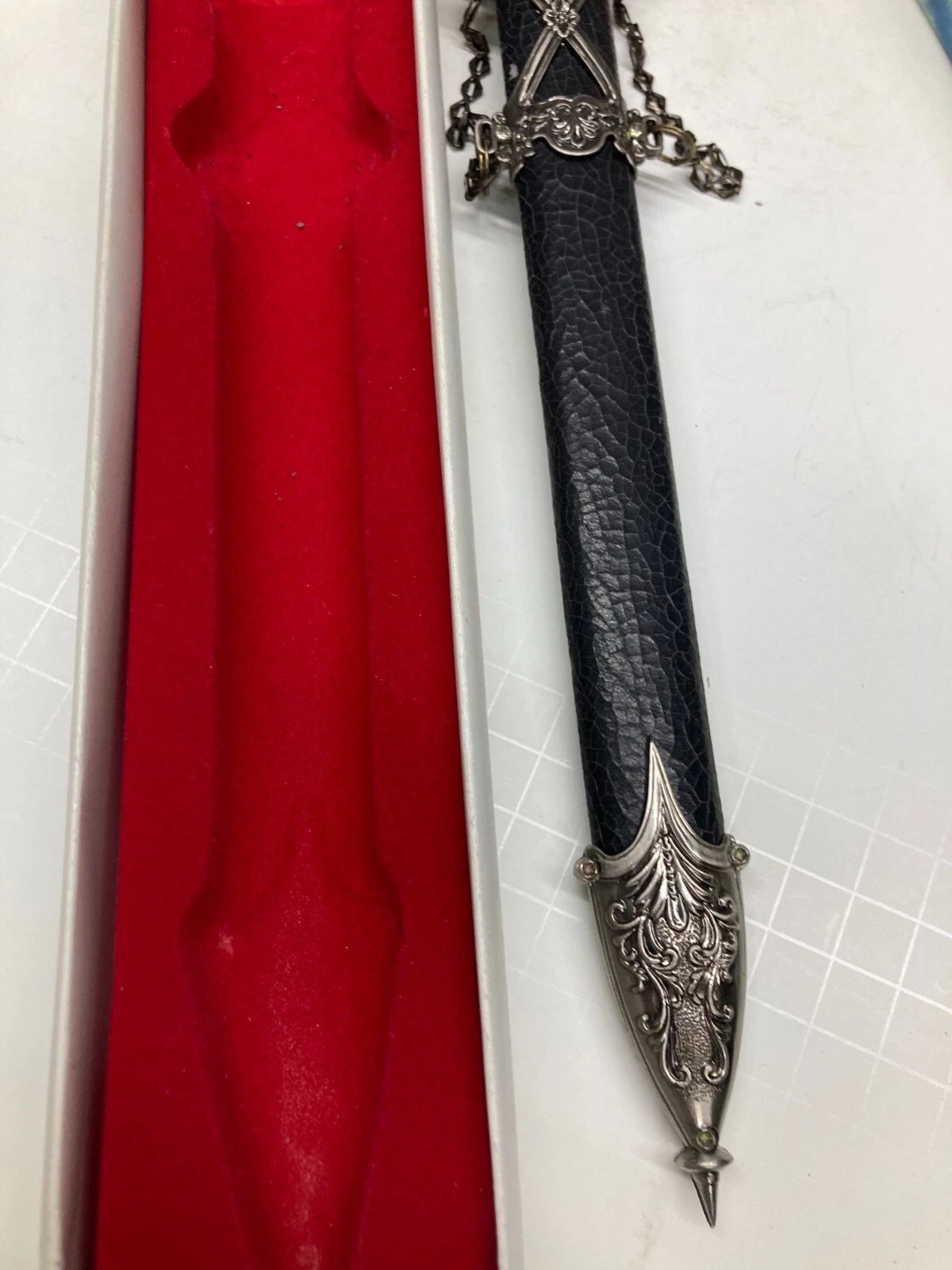 DECORATIVE / CEREMONIAL DAGGER WITH BLACK CRACKLE SHEATH HK801S Condition: Dealer New Old Stock (NOS), circa 1997. Some boxes may include price tags, handwriting, or small scuffs from storage or handling.