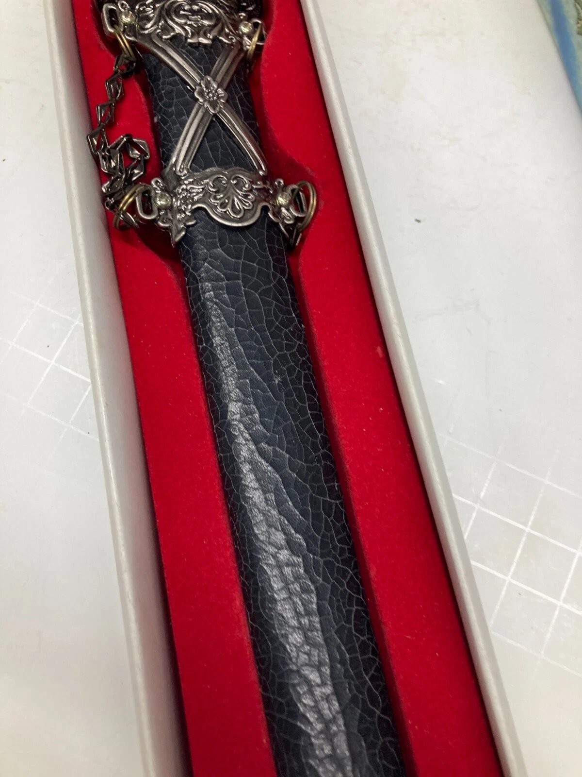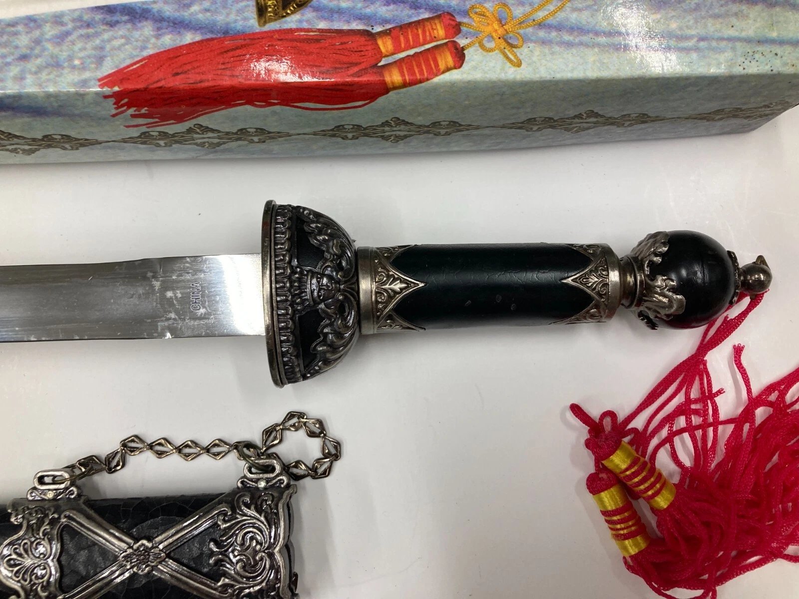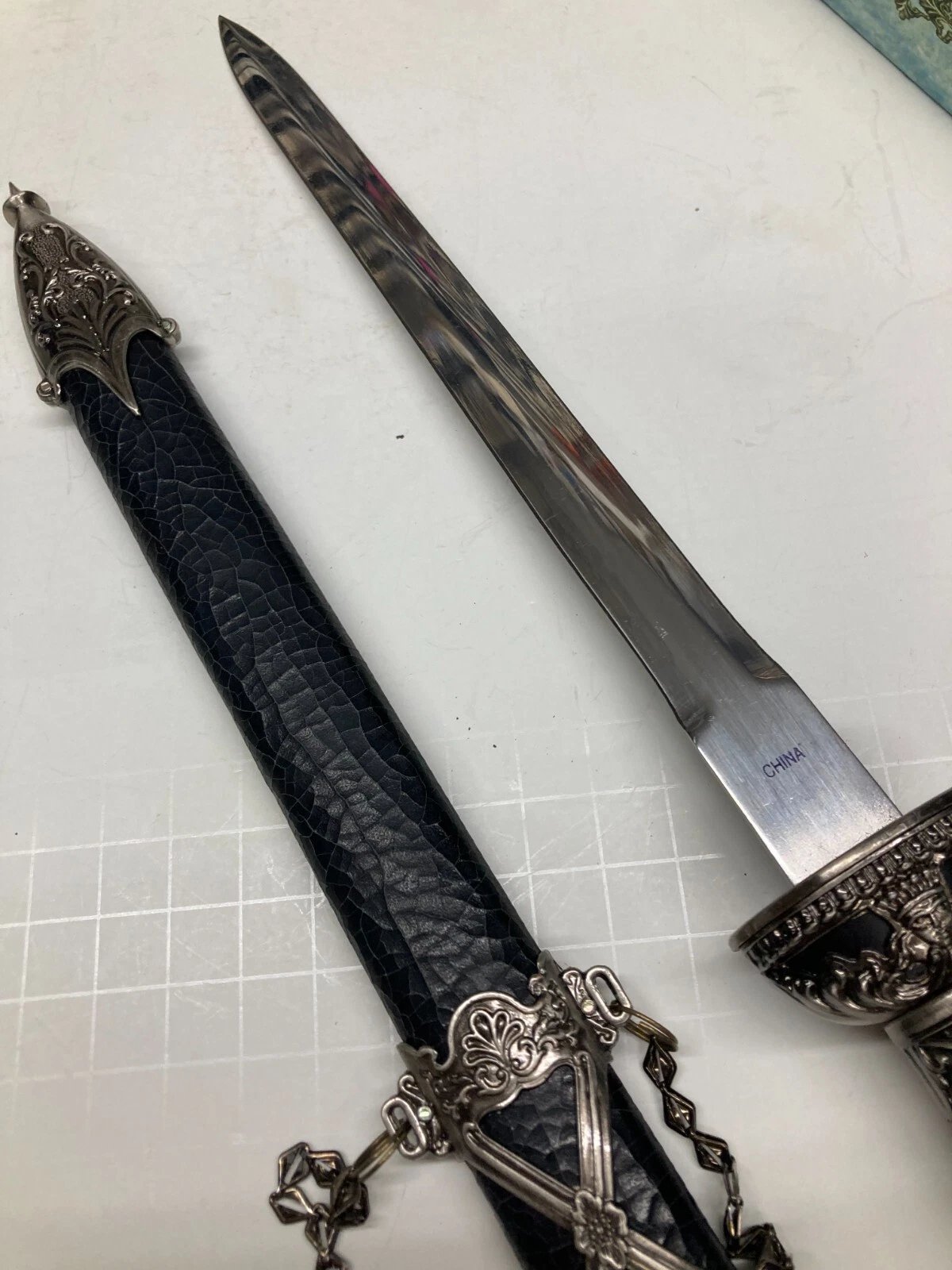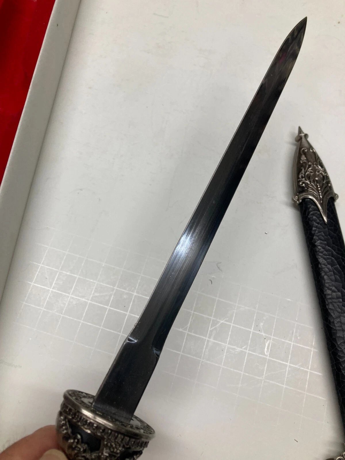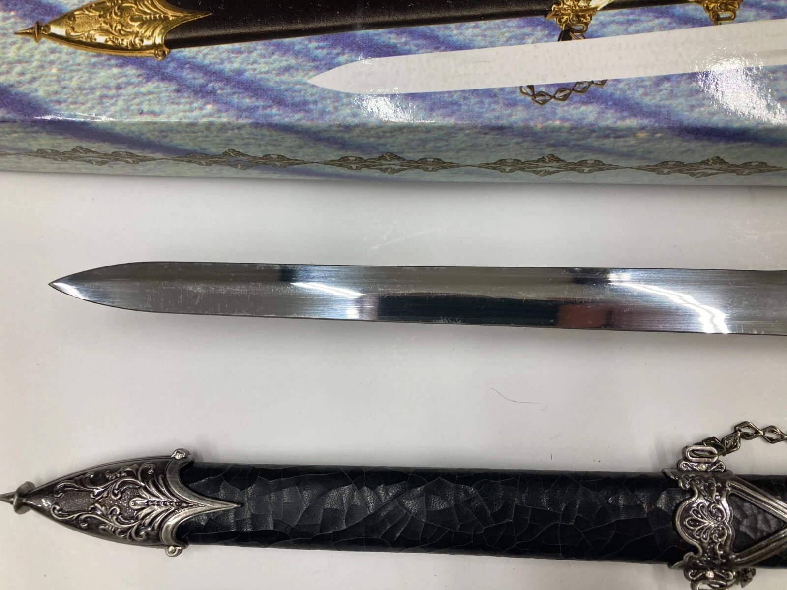 DECORATIVE / CEREMONIAL DAGGER WITH BLACK CRACKLE SHEATH HK801S Condition: Dealer New Old Stock (NOS), circa 1997. Some boxes may include price tags, handwriting, or small scuffs from storage or handling.