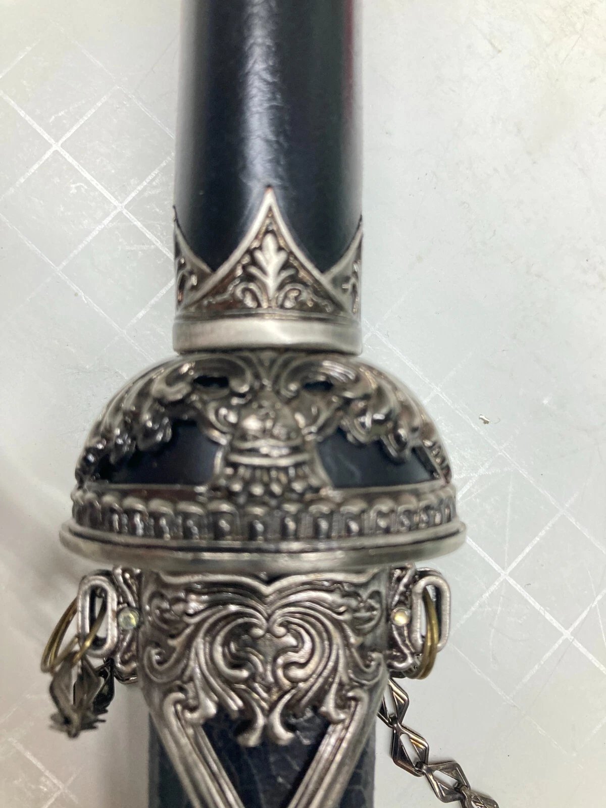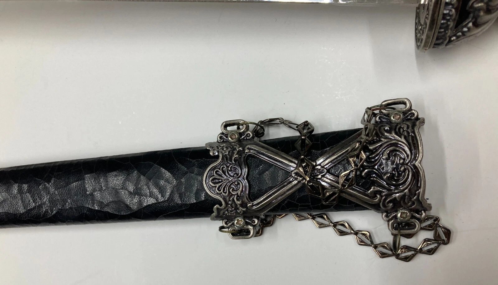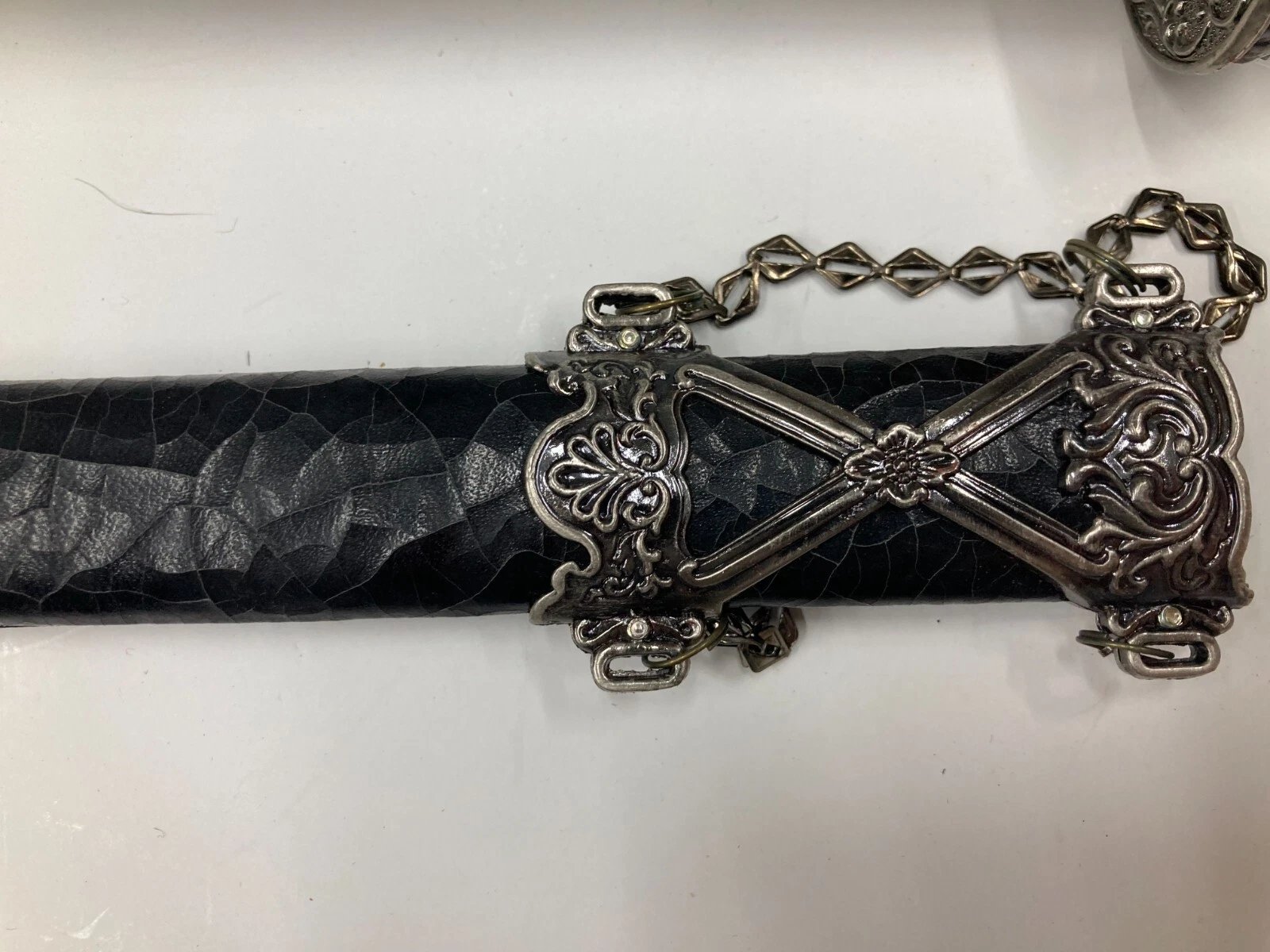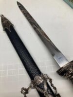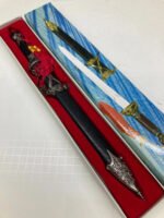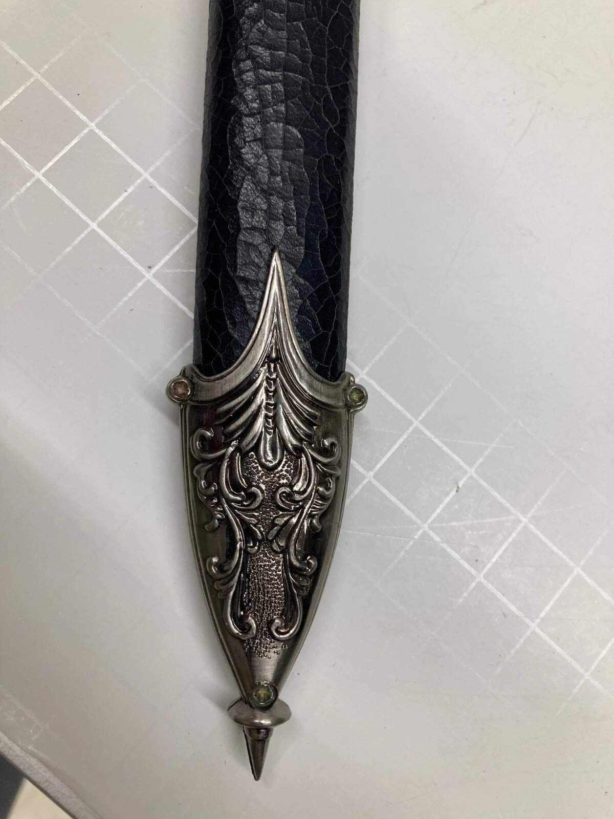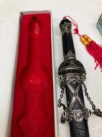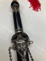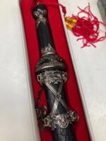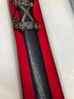 Decorative or ceremonial dagger featuring a sharpened stainless-steel blade with a distinctive black crackle-pattern sheath. Designed as a collector or display piece, not intended for cutting use. Includes original sheath and packaging.