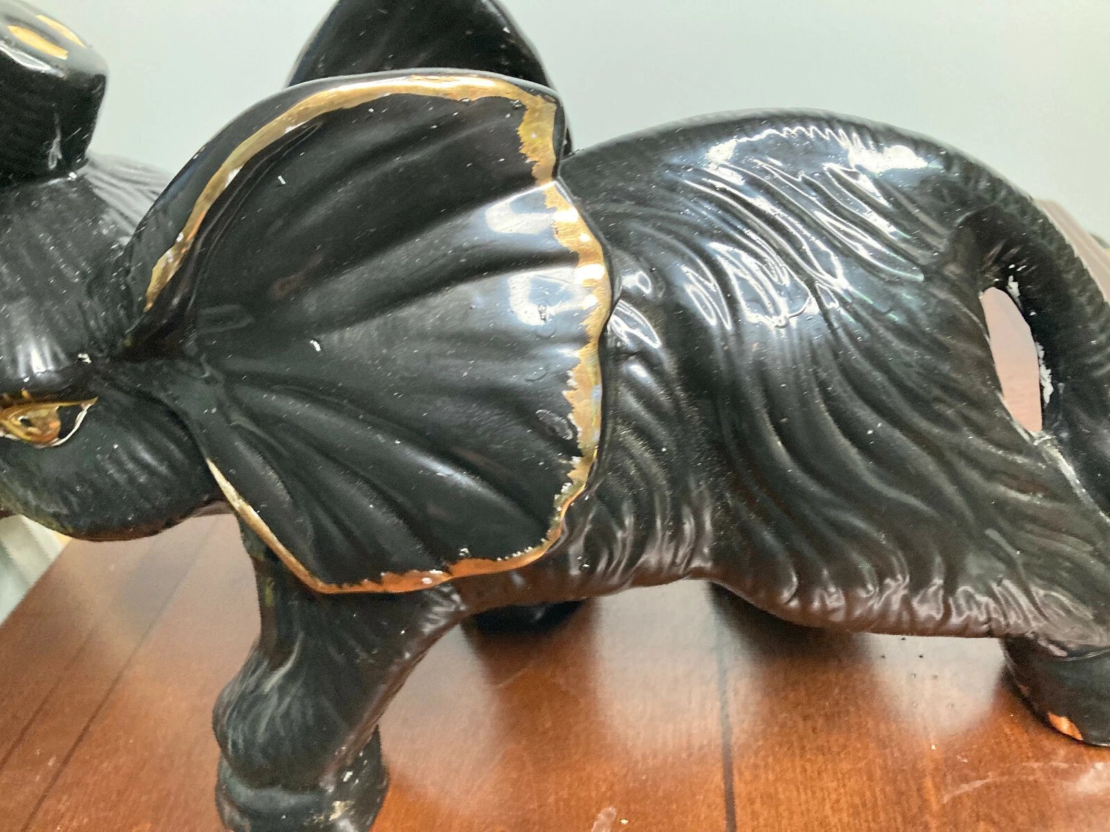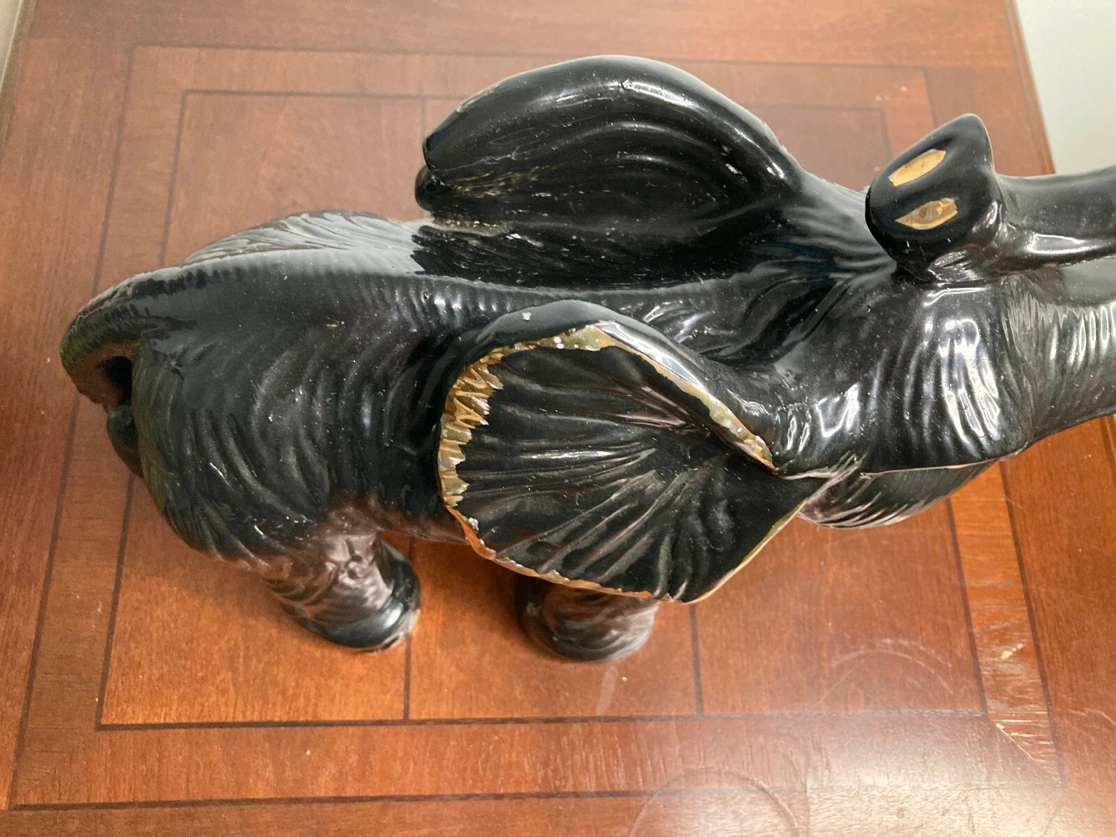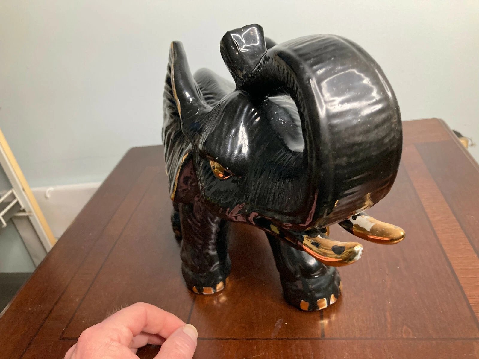 LARGE GLOSS BLACK AND GOLD ACCENT PORCELAIN-CERAMIC ELEPHANT Condition: Dealer New Old Stock (NOS) Collectible: Yes UPC: Unknown Country of Manufacture: Unknown Manufacturer: Unknown Large glossy black porcelain-ceramic elephant with elegan