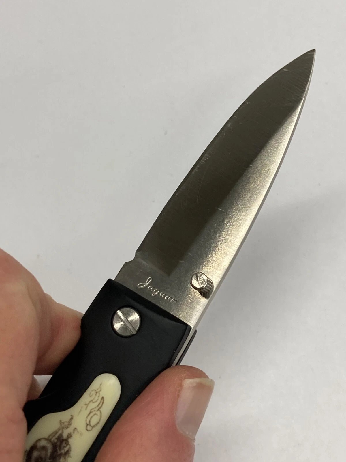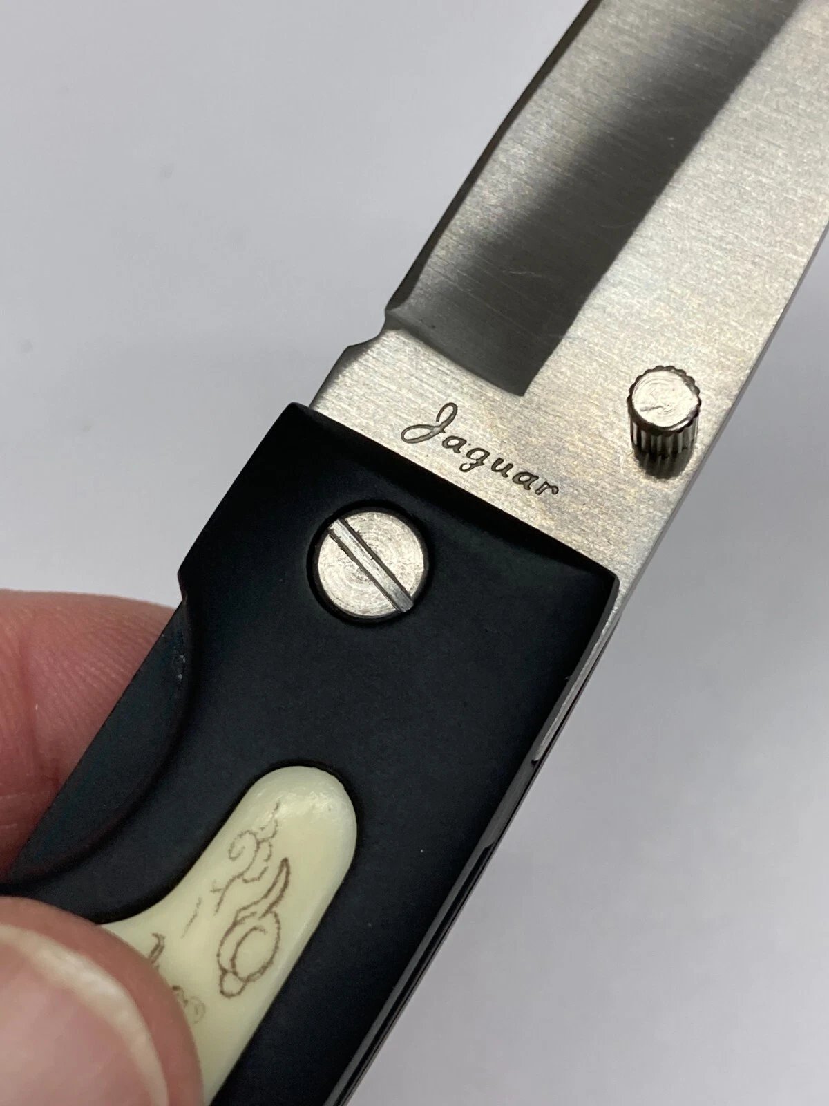 DRAGON FOLDING KNIFE /PLAIN BLADE, LINER LOCK IN PRESENTATION BOX C-7037DNB Condition: New (Dealer Old Stock – NOS) Collectible: Yes Brand / Manufacturer: Jaquar Model Number: C-7037DNB Country of Manufacture: China Stored for over 25 years