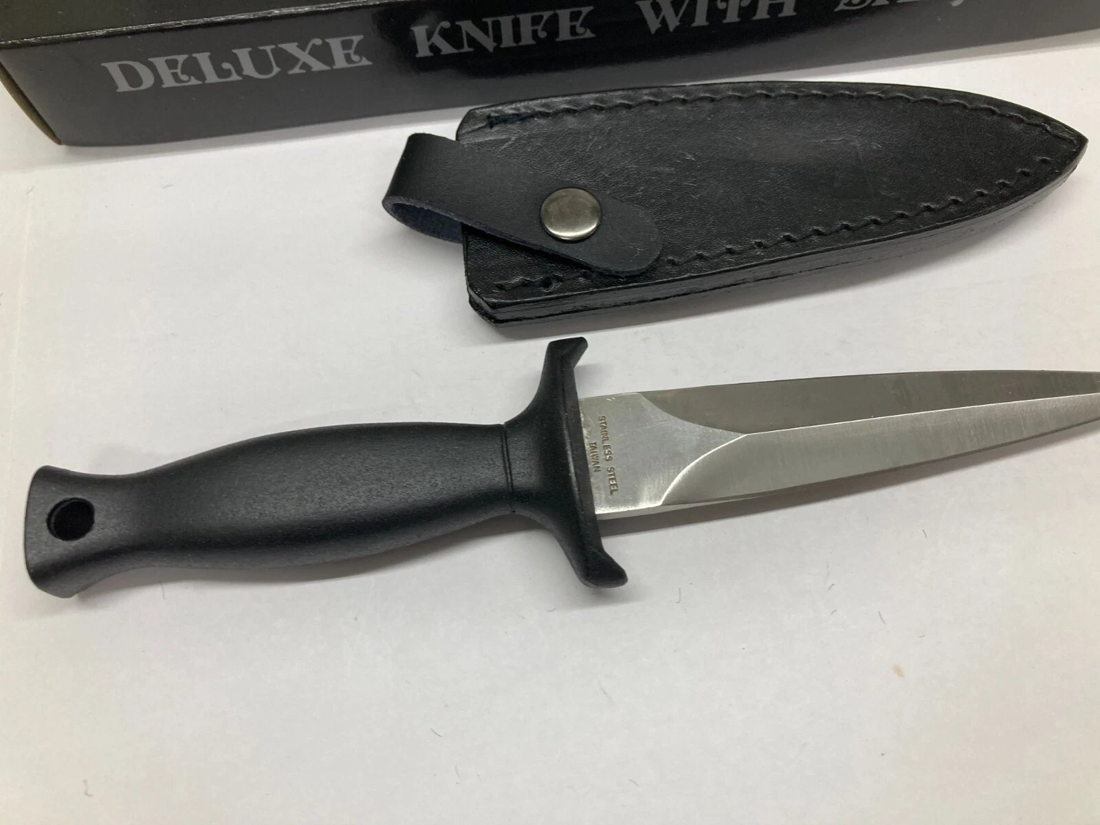 FIXED BLADE KNIFE WITH LEATHER SHEATH — MODEL G-20L Condition: New (Dealer Old Stock — Stored Over 20 Years) Brand: Unbranded Model Number: G-20L Country of Manufacture: Taiwan Description: Vintage fixed-blade knife featuring a polished sil