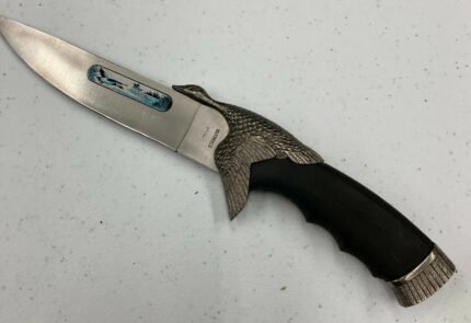 Vintage fixed-blade knife featuring a polished silver stainless steel spear-point blade paired with a metal handle and fitted leather sheath. Originally stored as dealer old stock for over two decades, this piece combines practical balance and collectible appeal. The sheath includes a pocket/belt clip rather than a standard belt loop.