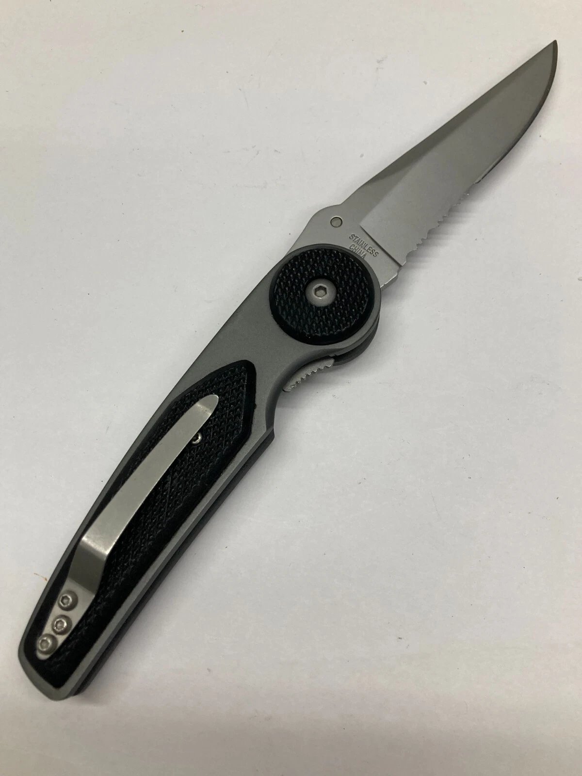 DARK GRAY FOLDING KNIFE, COMBO BLADE / CLIP / LINER LOCK C-09A Condition: New (Dealer Old Stock – NOS) Brand / Manufacturer: Jaquar Model Number: C-09A Country of Manufacture: China UPC: N/A Stored for over 25 years and never used. Knife is