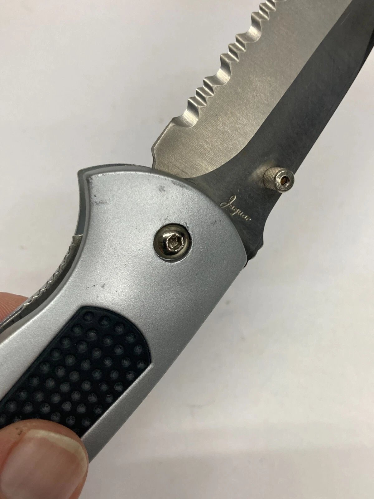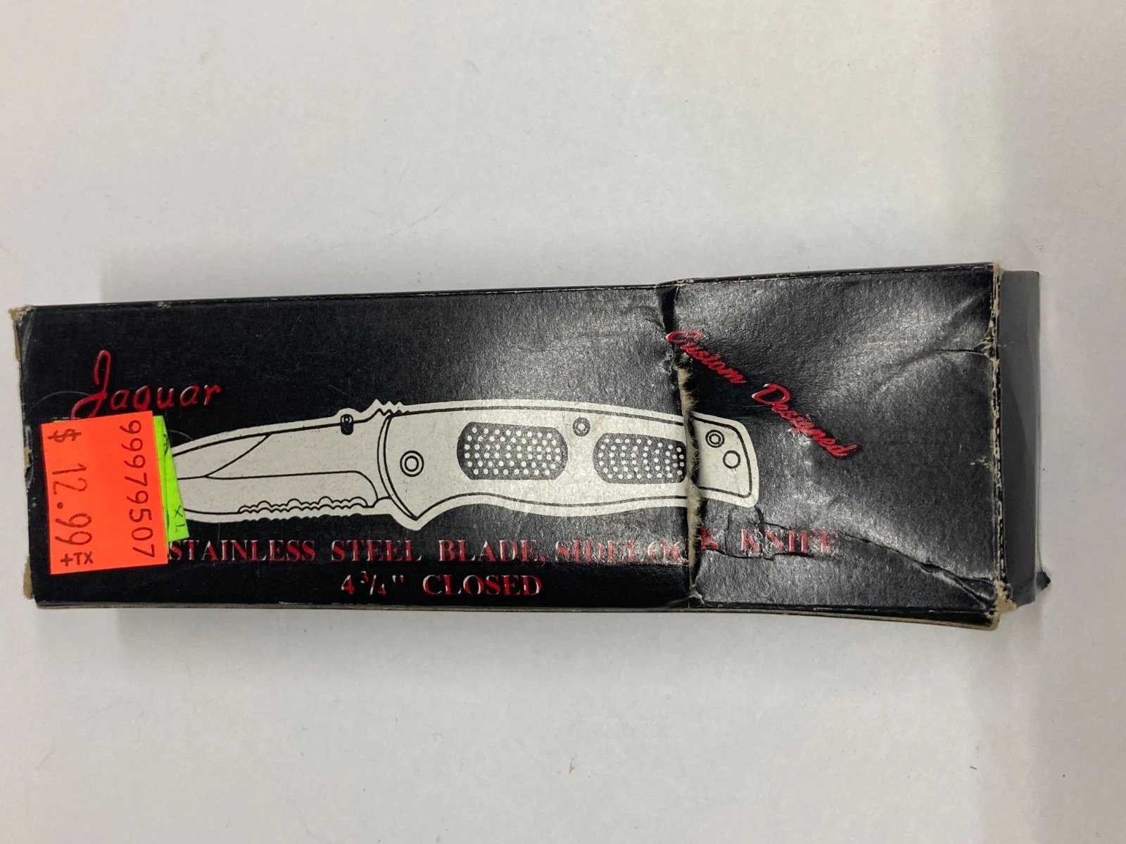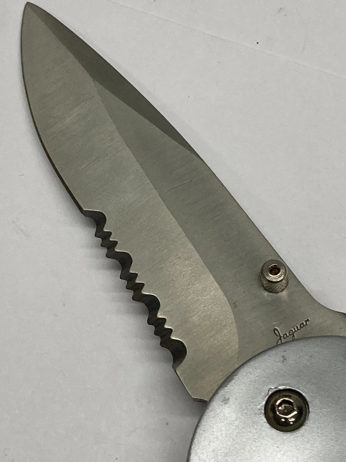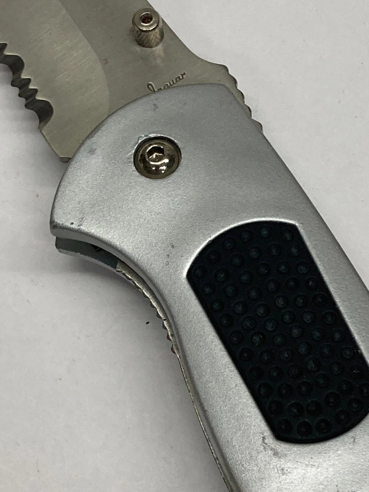 JAQUAR FOLDING KNIFE / COMBO BLADE, THUMB KNOB, LINER LOCK LK-4414S Condition: New (Dealer Old Stock – NOS) Brand / Manufacturer: Jaquar Model Number: LK-4414S Country of Manufacture: China UPC: N/A Stored for over 25 years and never used.