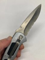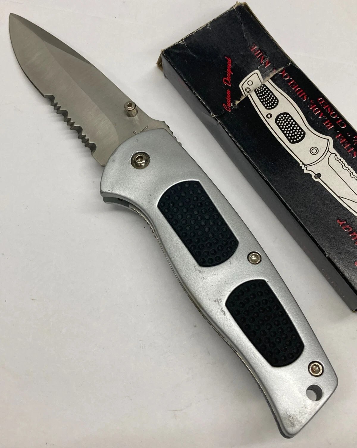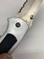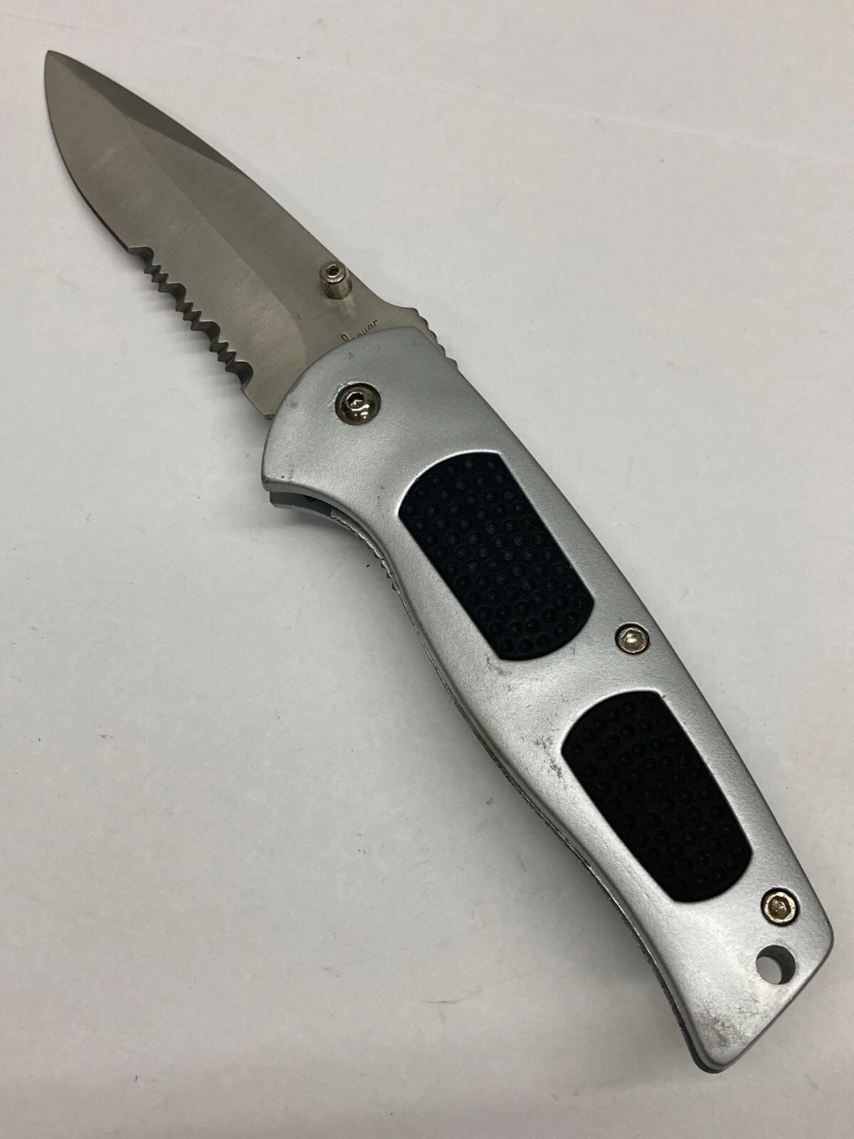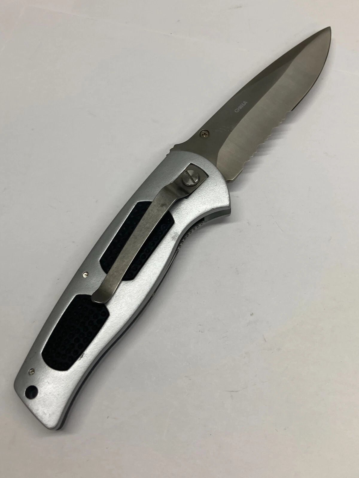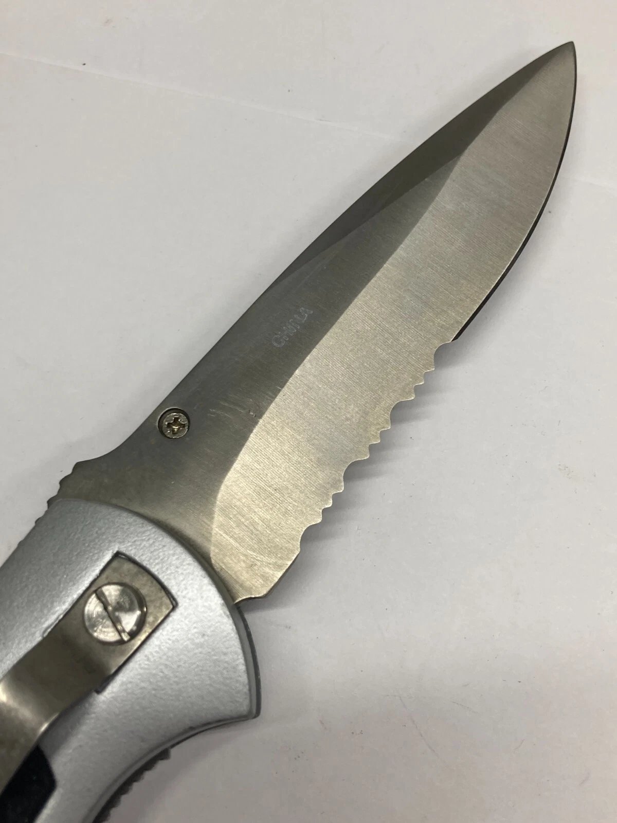 JAQUAR FOLDING KNIFE / COMBO BLADE, THUMB KNOB, LINER LOCK LK-4414S Condition: New (Dealer Old Stock – NOS) Brand / Manufacturer: Jaquar Model Number: LK-4414S Country of Manufacture: China UPC: N/A Stored for over 25 years and never used.