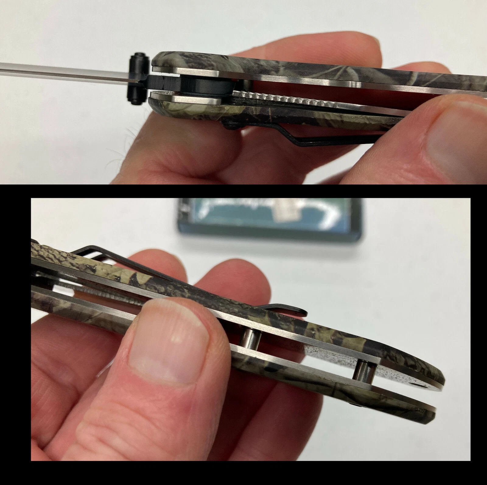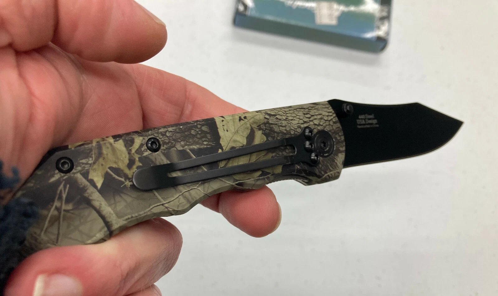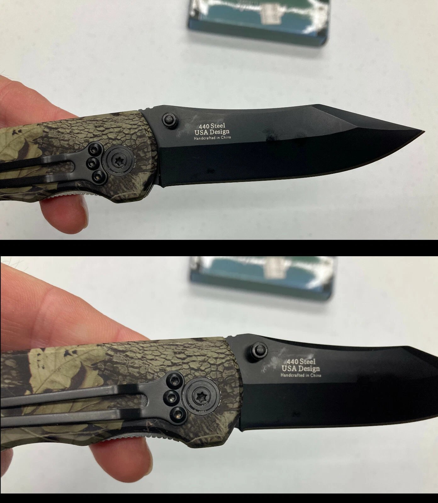 Folding lockblade knife featuring a camouflage metal handle and black 440 steel clip point blade. Heavy-duty build with inner locking mechanism and pocket clip. Ideal for collectors, work use, or display.
