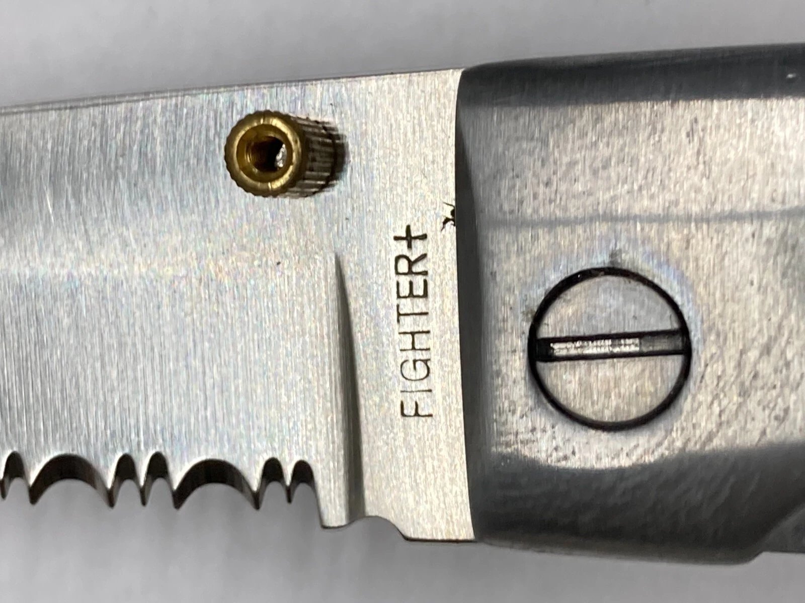 Vintage Fighter RA7037SDE folding pocket knife featuring a stag-style plastic inlay handle and combination-edge 440 stainless steel blade. Manufactured circa 1998 and preserved as dealer old stock for more than two decades. Comes in original packaging and includes both a belt clip and lanyard/keychain hole for convenient carrying.