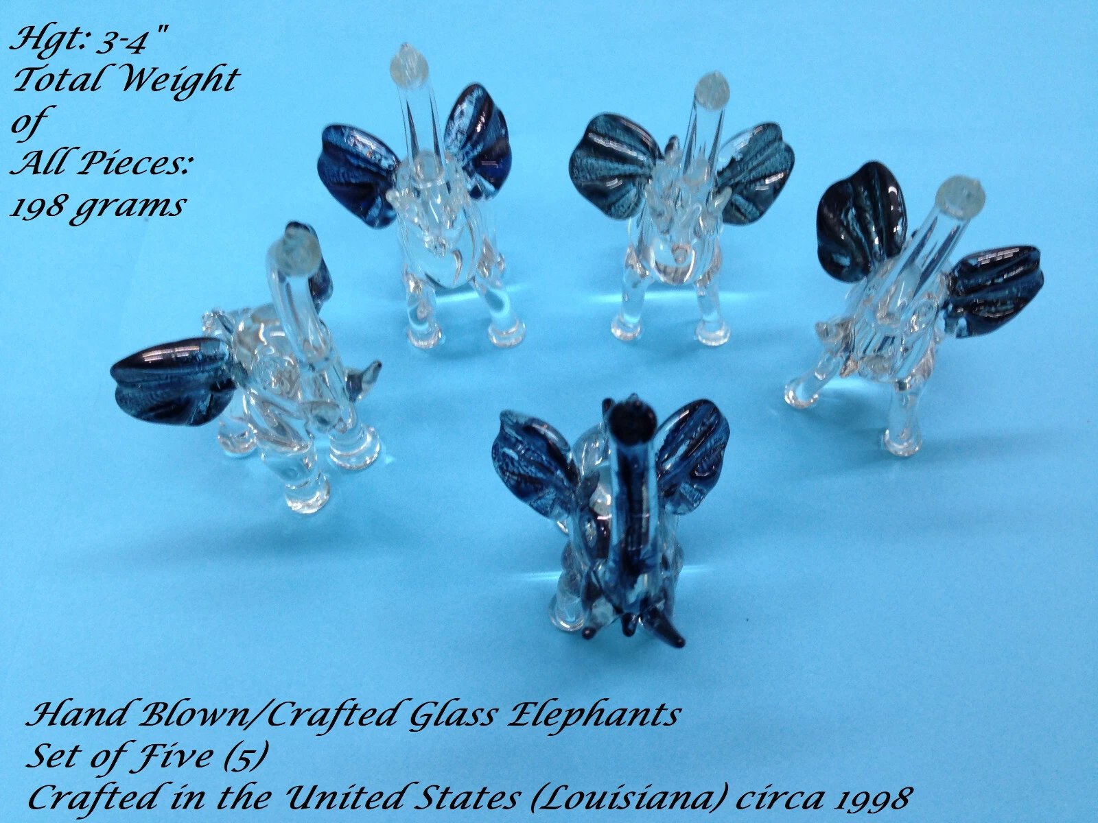HAND BLOWN / CRAFTED GLASS ELEPHANT COLLECTION – 5 PIECES – MADE IN LOUISIANA, USA Condition: Excellent, handcrafted collectible set Product Description: Hand-blown and hand-crafted glass elephant set made in Louisiana, USA, circa 1998. Eac