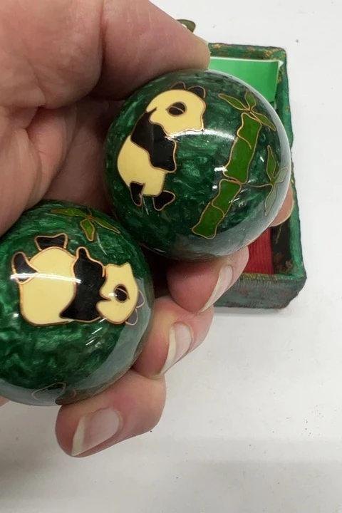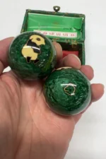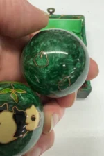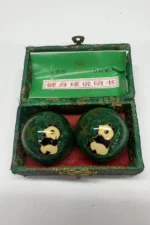 Green Set with Panda Designs Green Box – Chinese Baoding Balls set featuring green balls with panda design in a green rectangle with closable lid. Dual high and low tone chimes. Approx. 1-7/10 inch diameter balls, Approx. 2.5 to 2.9 oz each. Ideal for hand exercise, stress relief, and display.