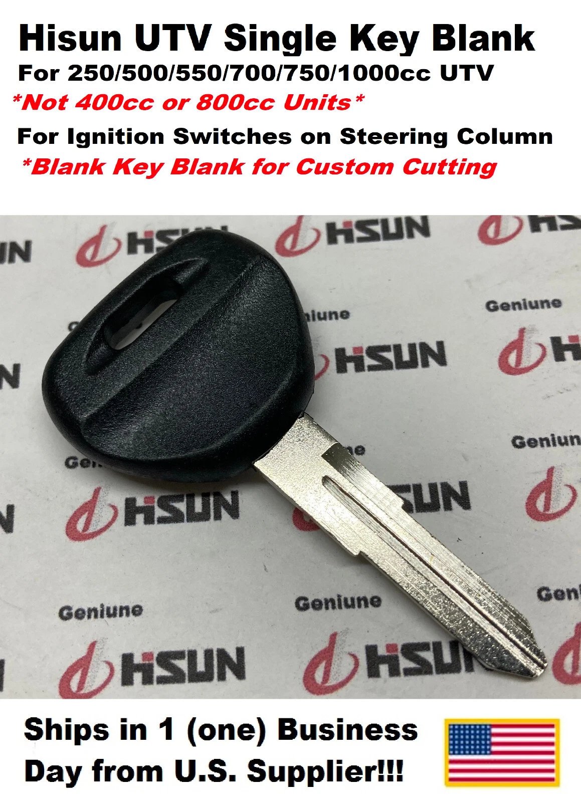 HISUN KEY BLANK – FOR 250cc / 500cc / 550cc / 700cc / 750cc / 1000cc UTVs (STEERING COLUMN IGNITION) (Not for 400cc or 800cc Models) Condition: New OEM: Yes (Hisun Genuine Replacement Part) Brand: Hisun Country of Manufacture: China Descrip