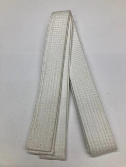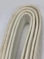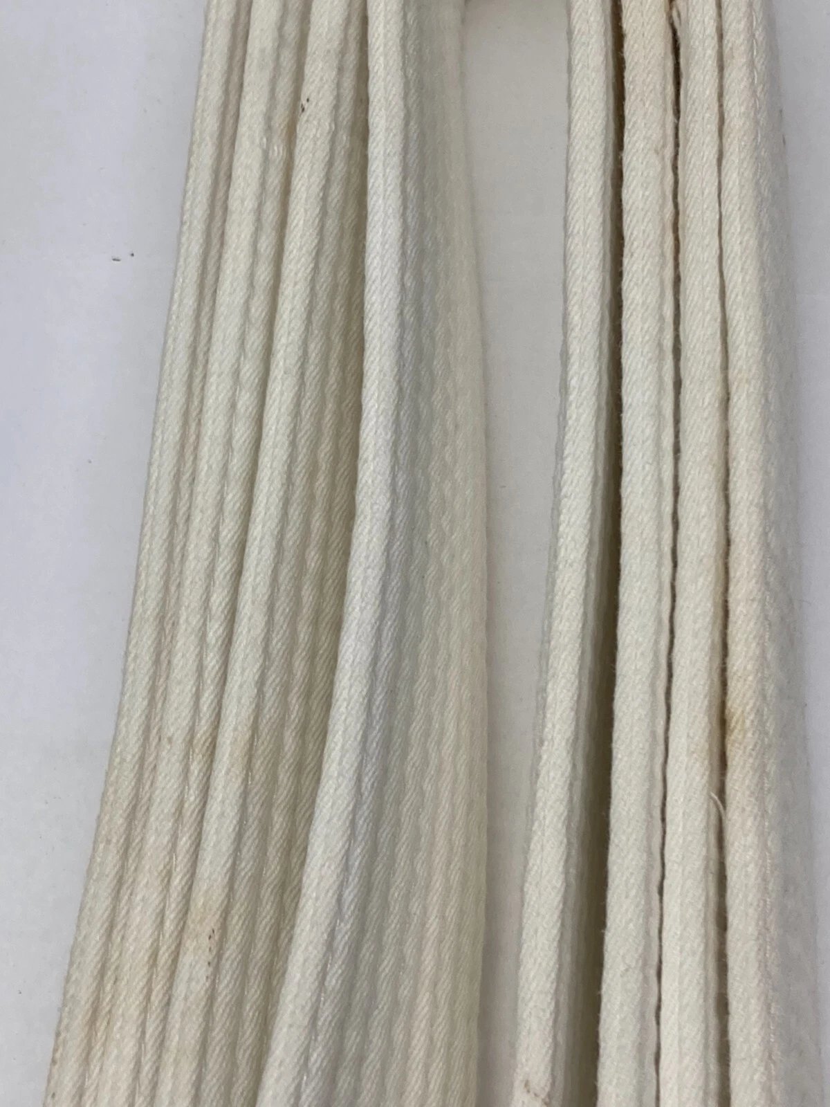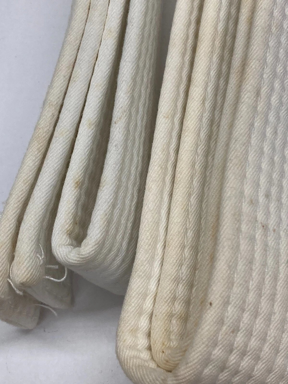 Traditional martial arts white belt suitable for Karate, Taekwondo (TKD), and Brazilian Jiu-Jitsu (BJJ). Made from 100% cotton for strength and flexibility. Belts may show slight discoloration due to age but remain structurally sound for training or display.