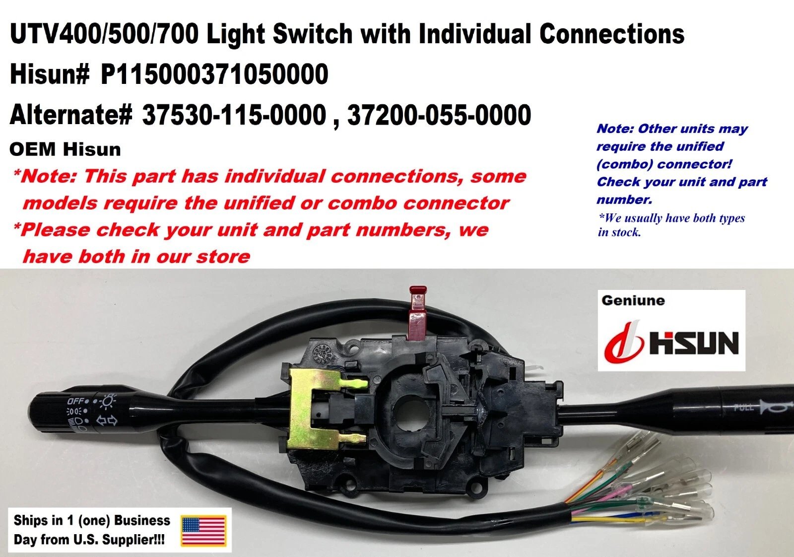 UTV400/500/700/800 LIGHT SWITCH ASSEMBLY / INDIVIDUAL WIRE CONNECTIONS (INCLUDES HORN AND TURN SIGNALS CONNECTIONS) – HISUN P115000371050000 Condition: New Country of Manufacture: Not specified OEM: Yes (Hisun) Hisun Part Number: P115000371