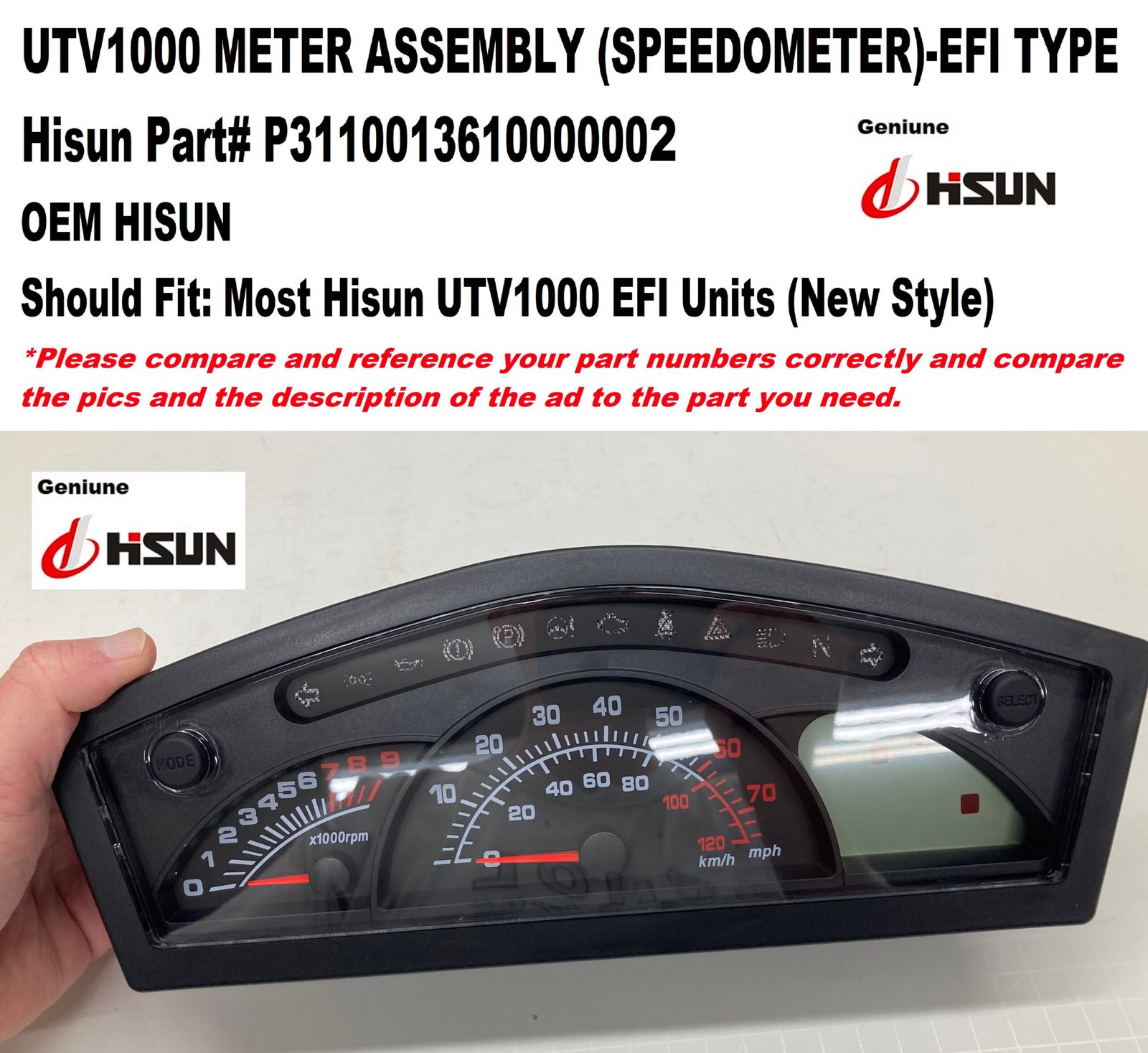 UTV1000 METER ASSEMBLY (SPEEDOMETER) – EFI TYPE Condition: New MPN / Item Number: P3110013610000002 Alternate Part Number: Country of Manufacture: Unknown Brand: Hisun Type: Meter Assembly / Speedometer Description: OEM Hisu