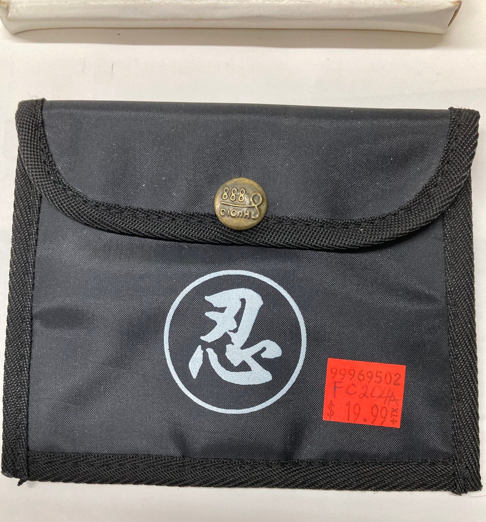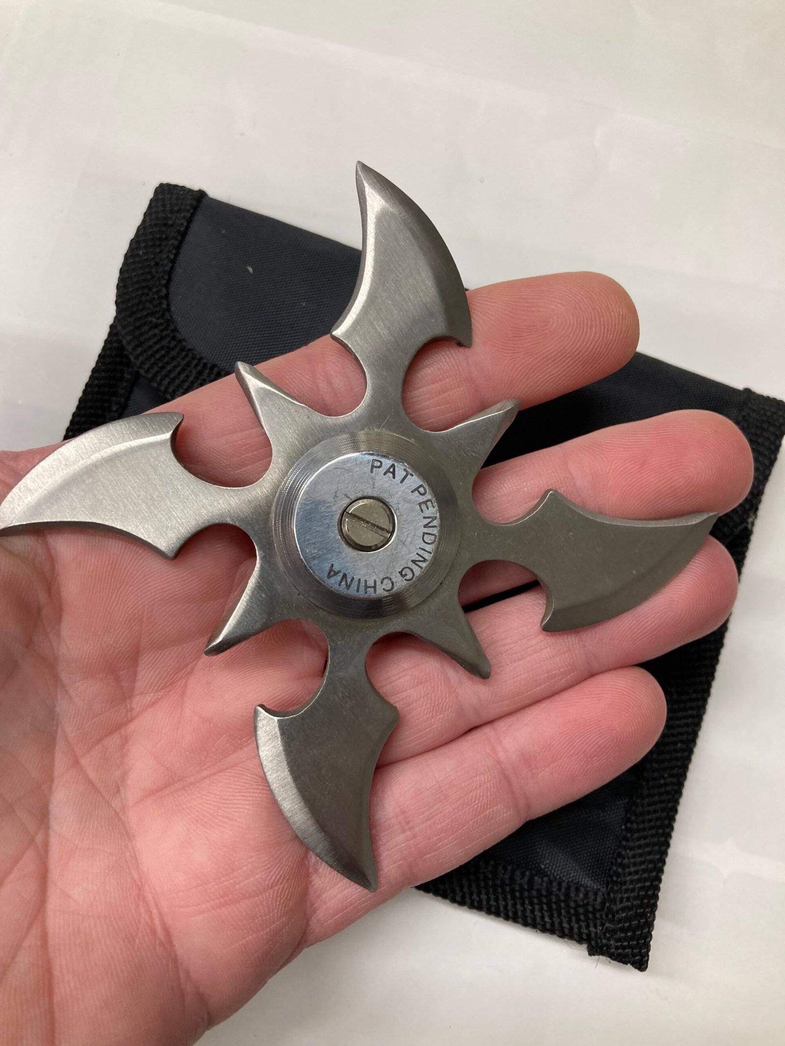 Brand: Master Cutlery, Year: 2003, Made in China, SS, Weight Ninja Throwing Star, Havoc, 4 Large Sharp Single Edged Blades with 4 Short Points w/Snap Closure Nylon Pouch with Belt Loop