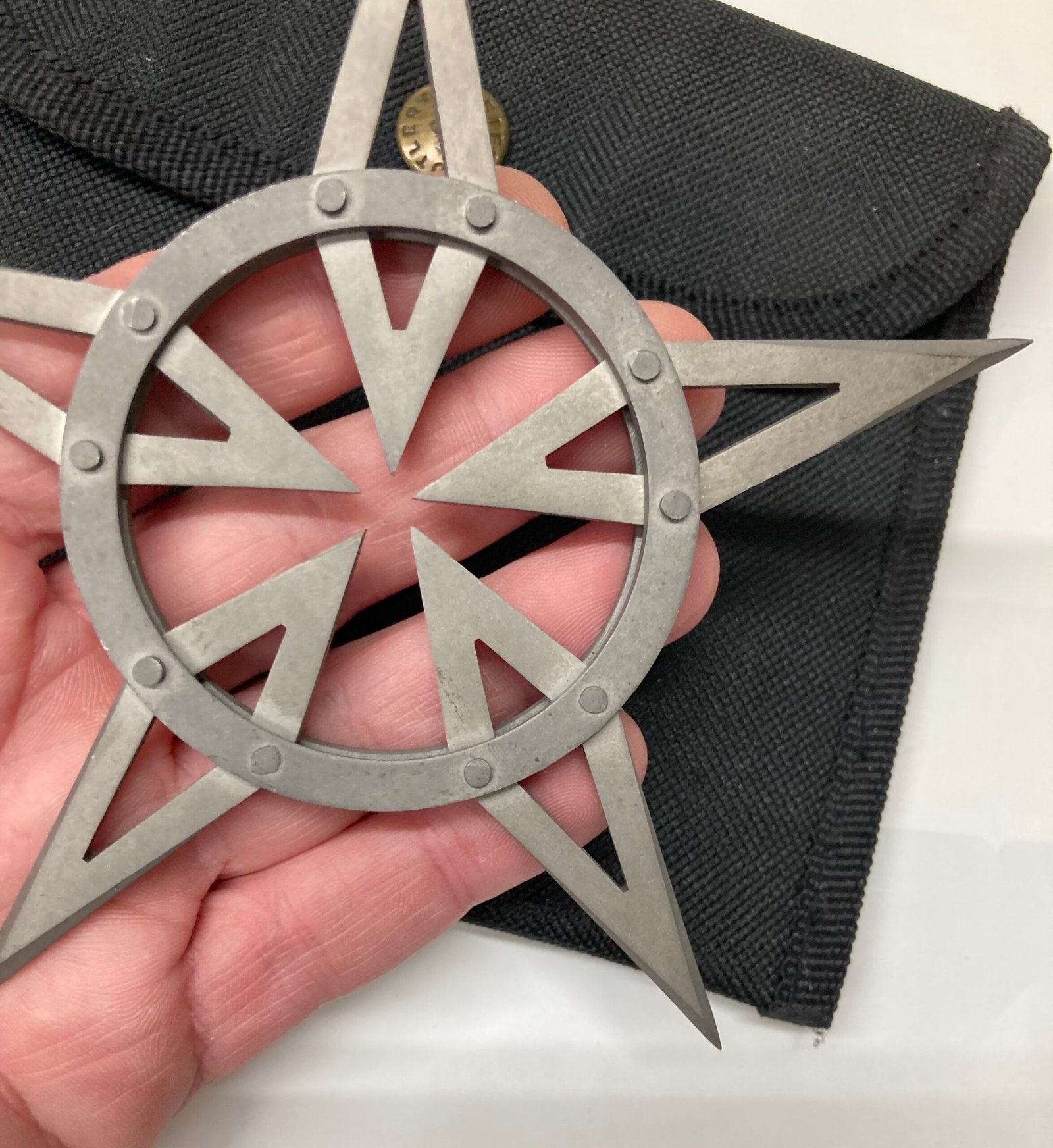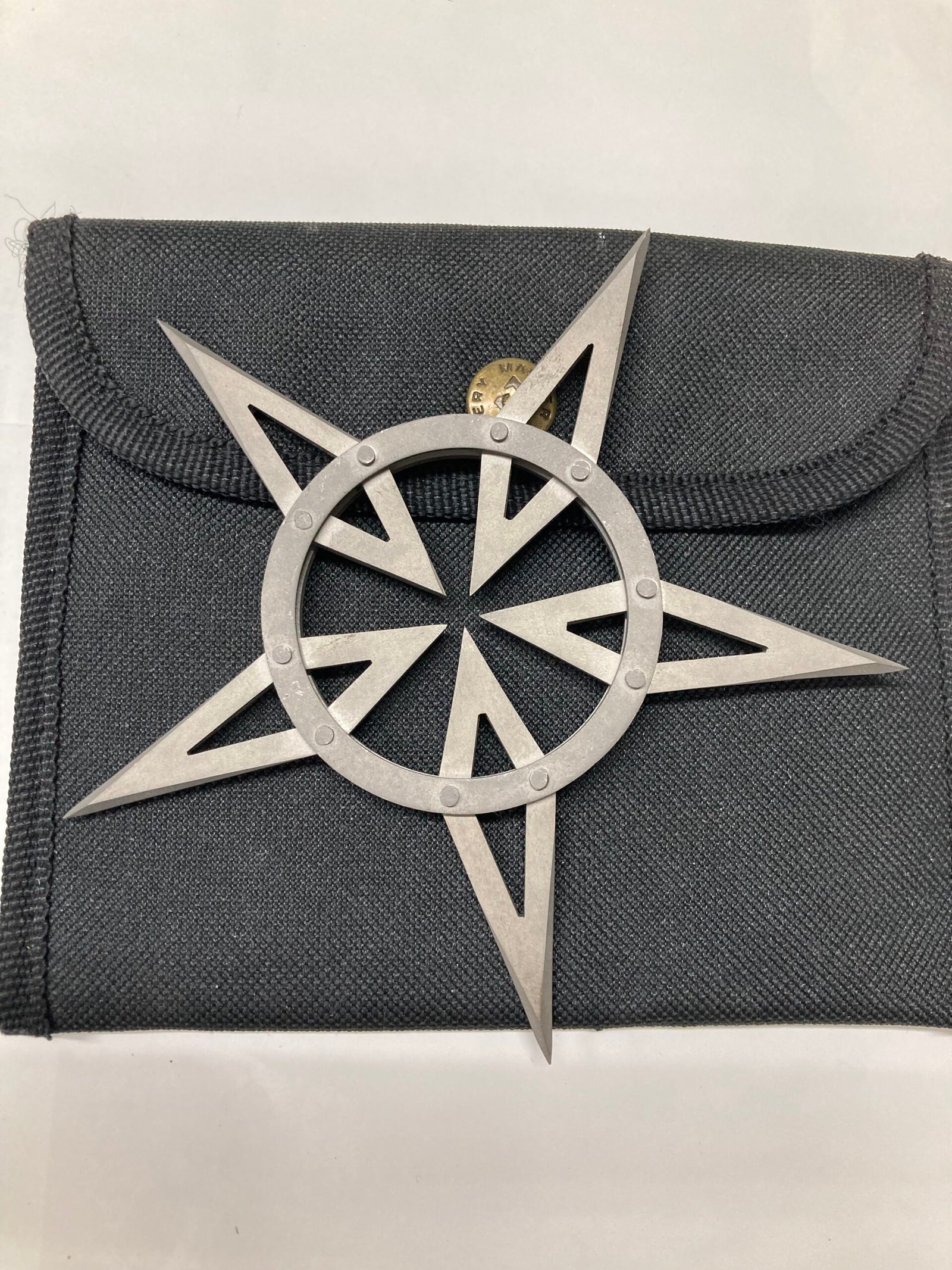 Brand: Master Cutlery, Year: 2003, Made in China, SS, 5 Large Sharp Points in Windmill Design Ninja Throwing Star/Snap Closure Nylon Pouch with Belt Loop