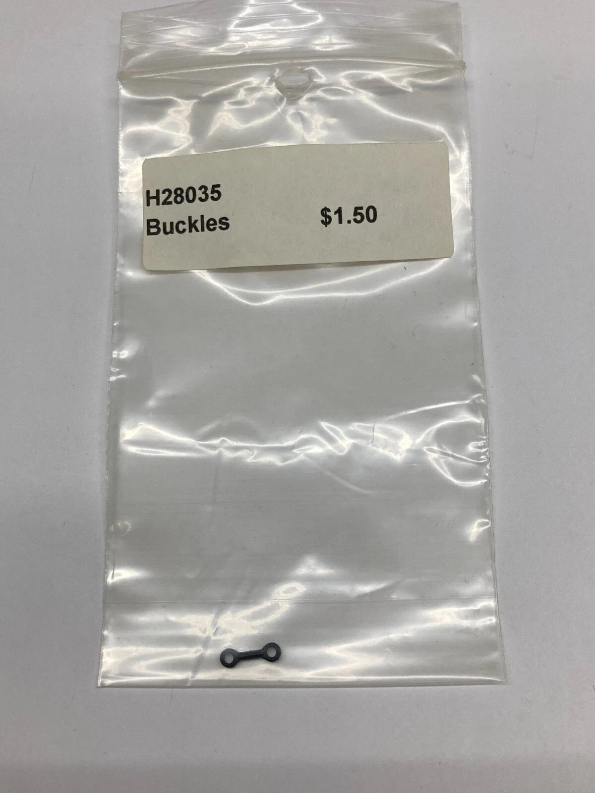 Dealer New Old Stock (NOS) buckle for R/C helicopter model H28035. Items are unused but have been in storage for decades. Bags may show slight discoloration, and some parts may have minor finish imperfections from long-term storage.