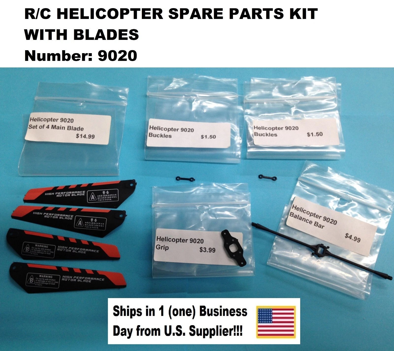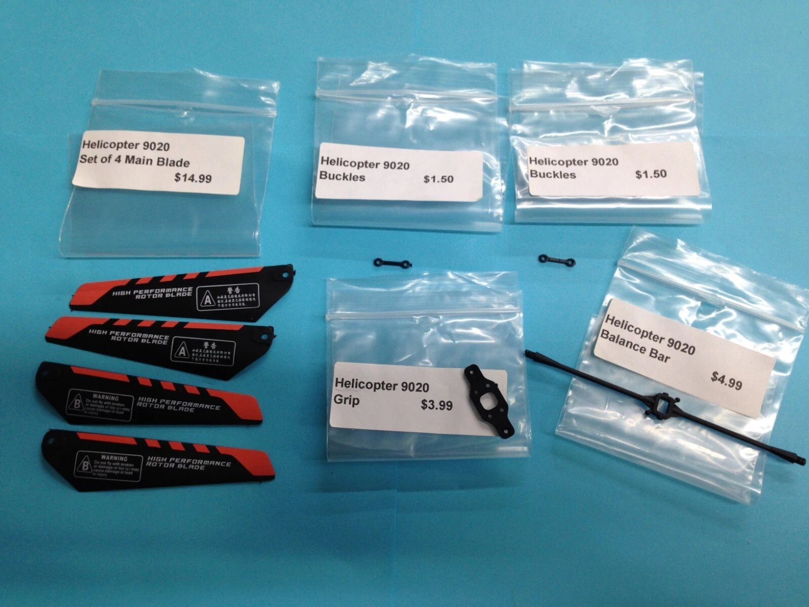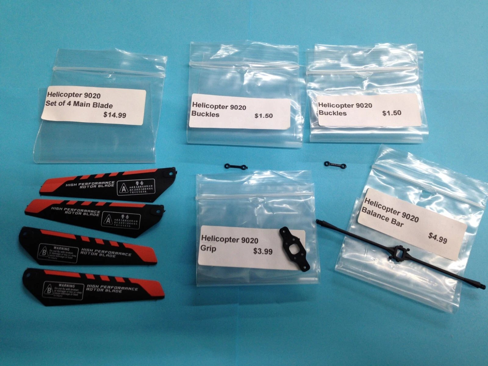 Dealer New Old Stock (NOS) spare parts kit with blades for R/C helicopter model 9020. Items are unused but have been in long-term storage for decades. Bags may show slight discoloration, and some parts may exhibit minor finish imperfections from storage.