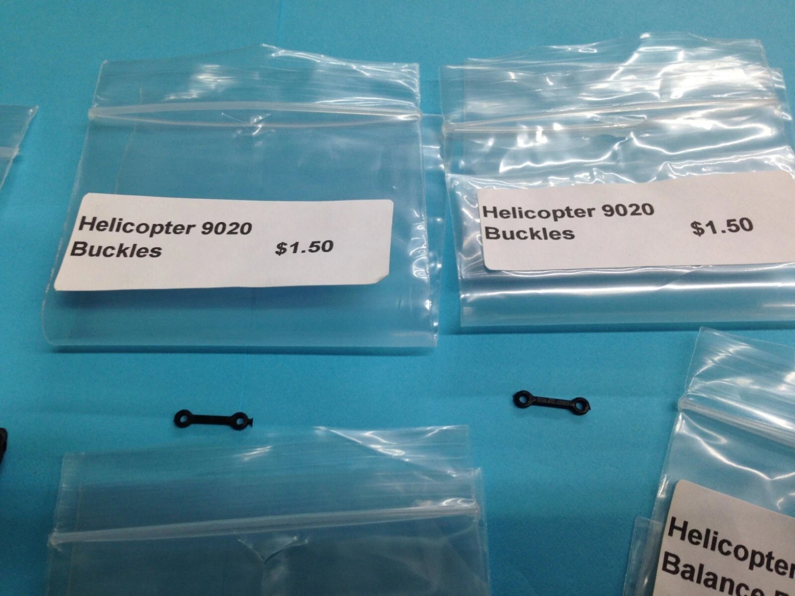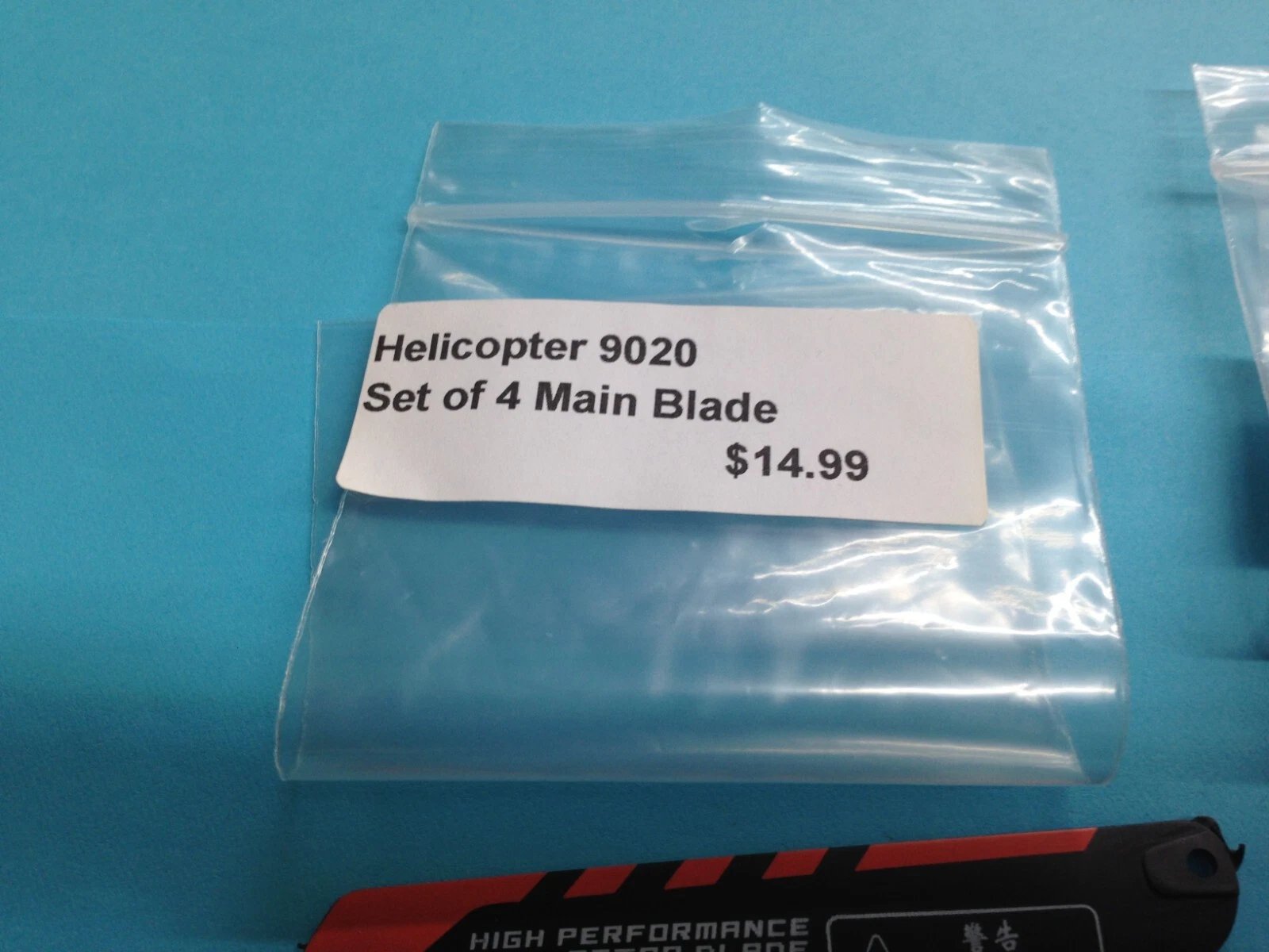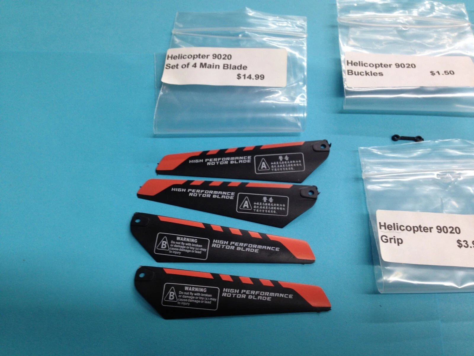 Dealer New Old Stock (NOS) spare parts kit with blades for R/C helicopter model 9020. Items are unused but have been in long-term storage for decades. Bags may show slight discoloration, and some parts may exhibit minor finish imperfections from storage.