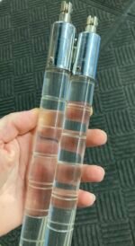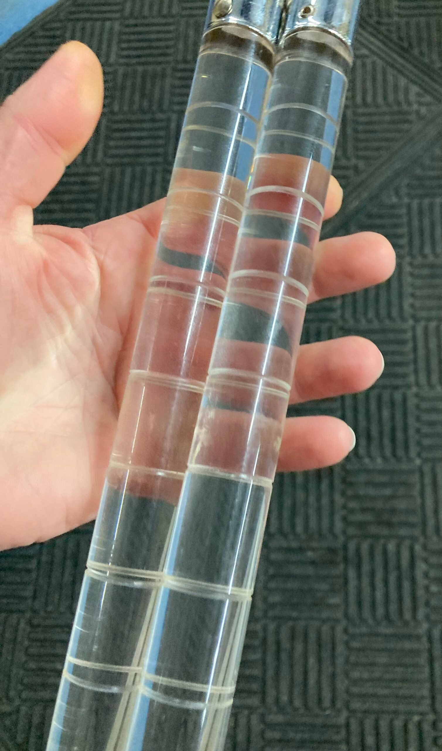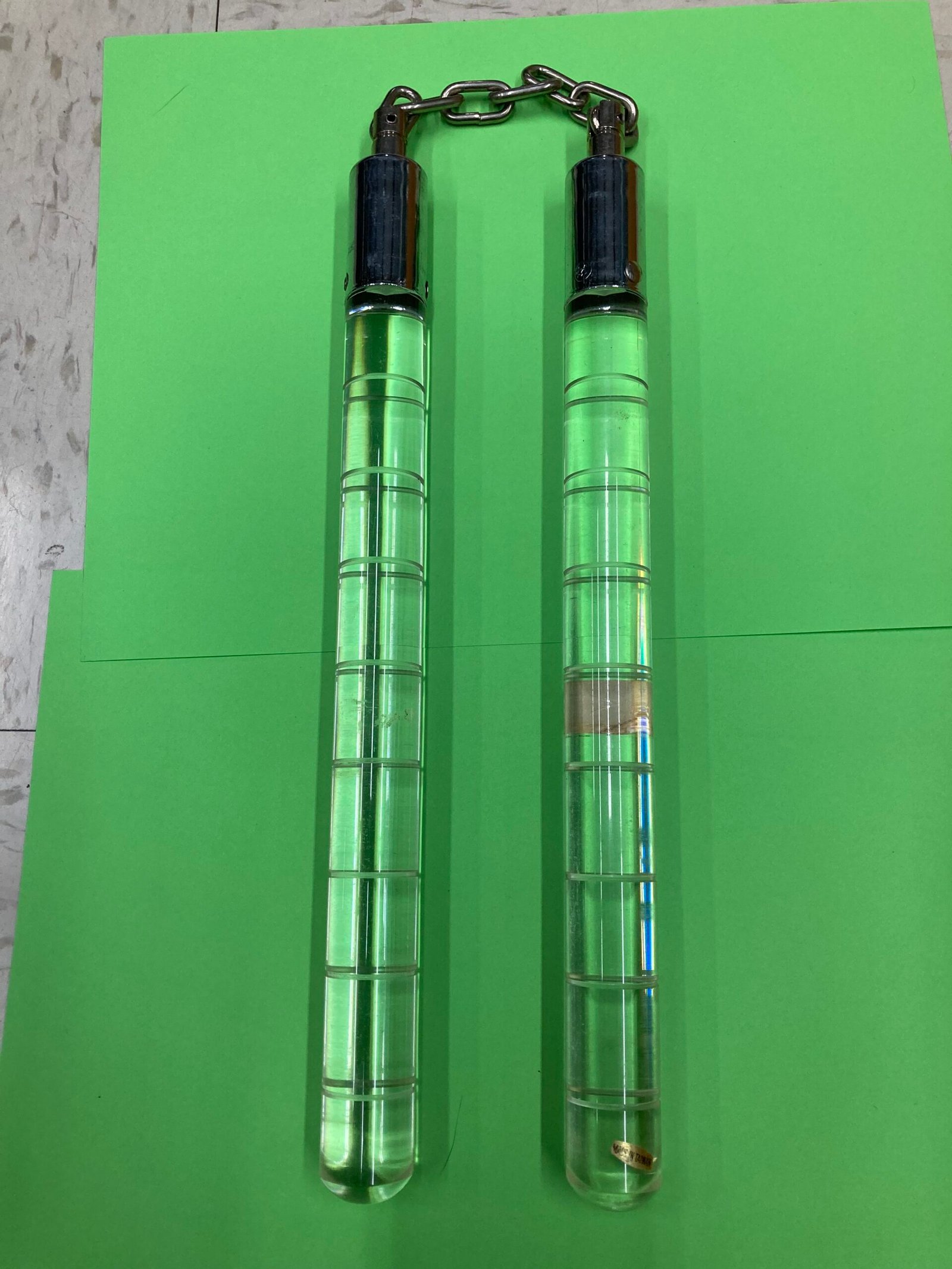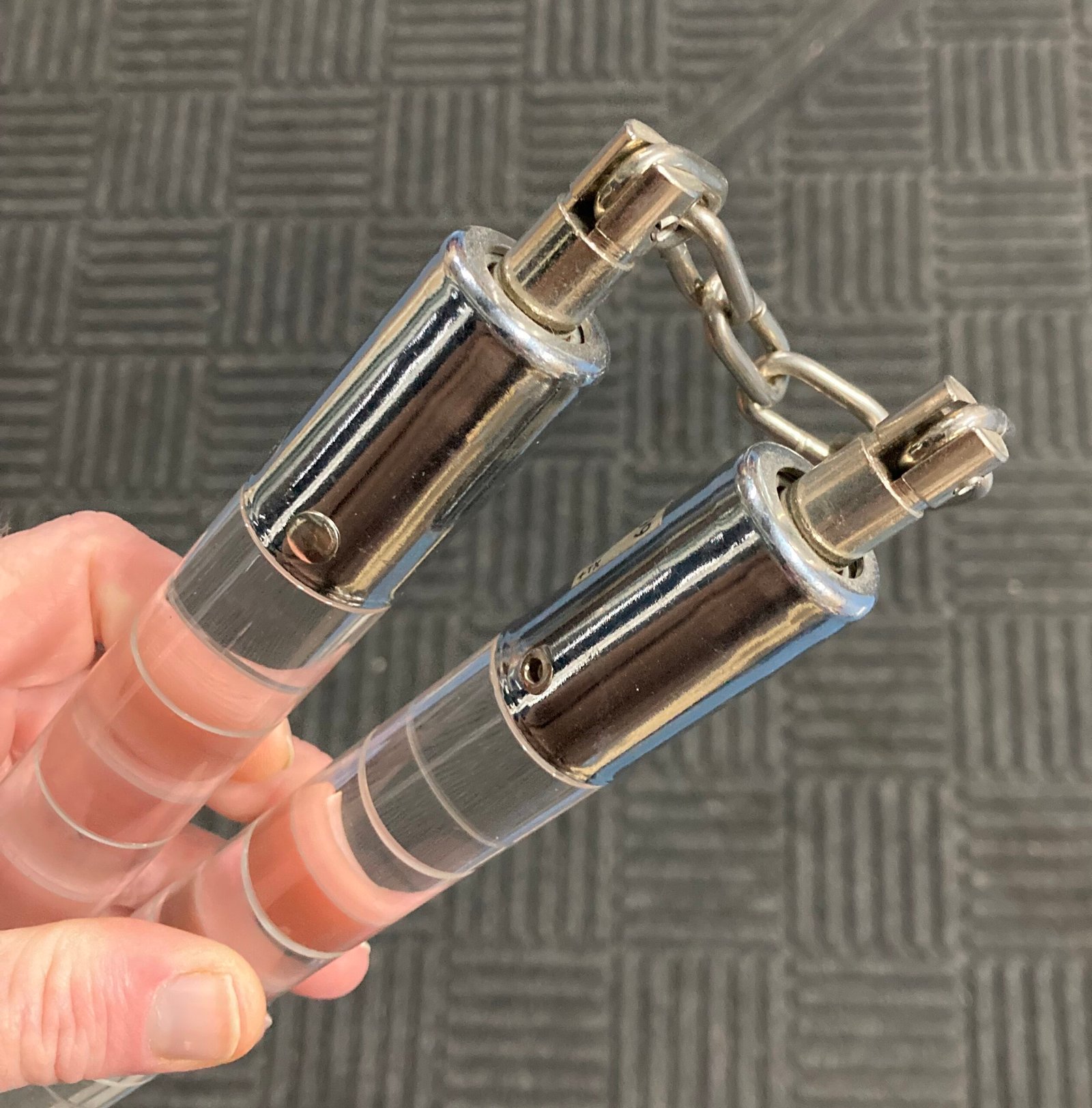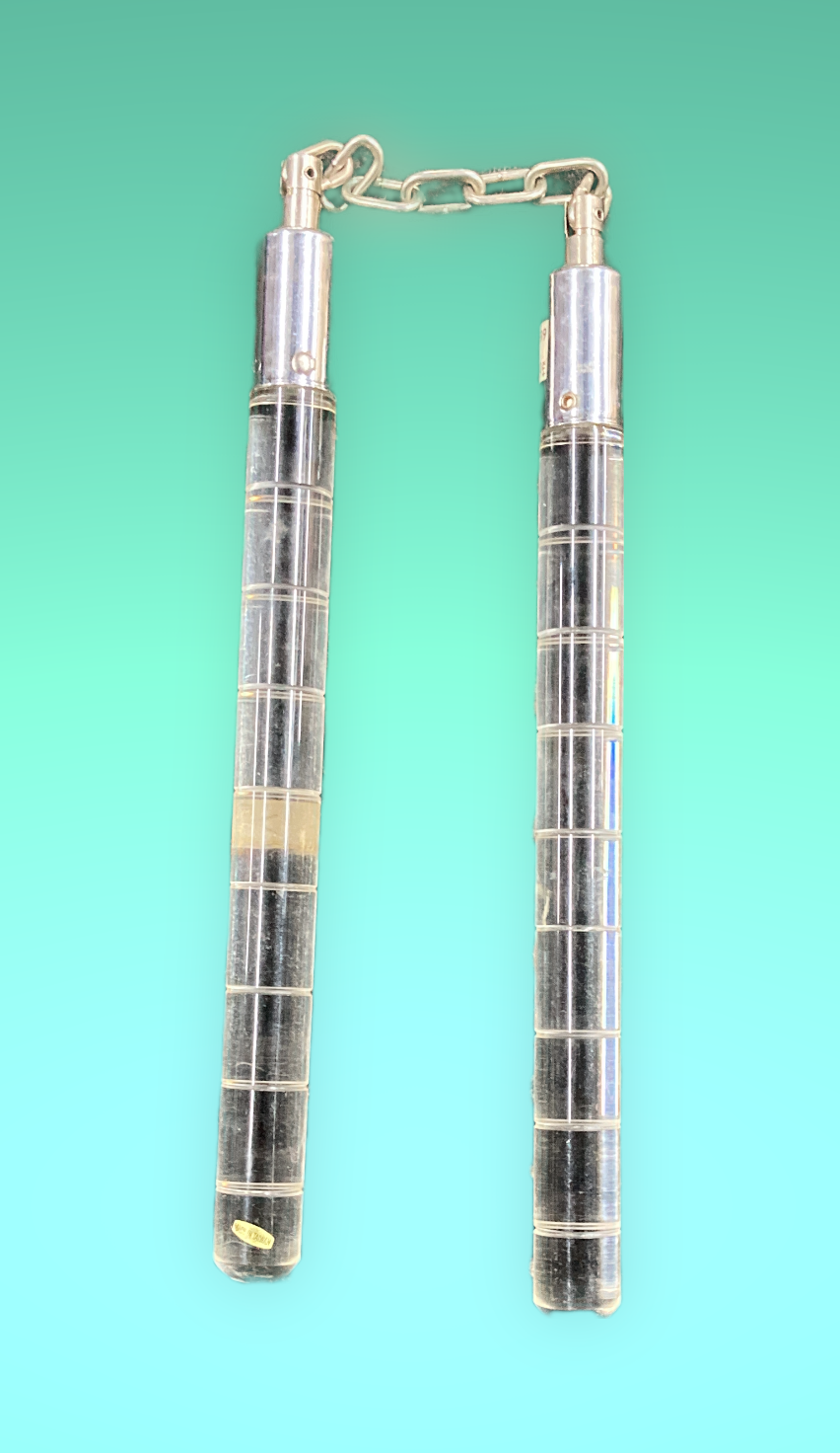 Acrylic nunchaku with etched line design, approx. 11-3/4″ handles and 6-1/4″ chain. Ball-bearing swivel chain. Durable, smooth, and ideal for training or demonstrations.