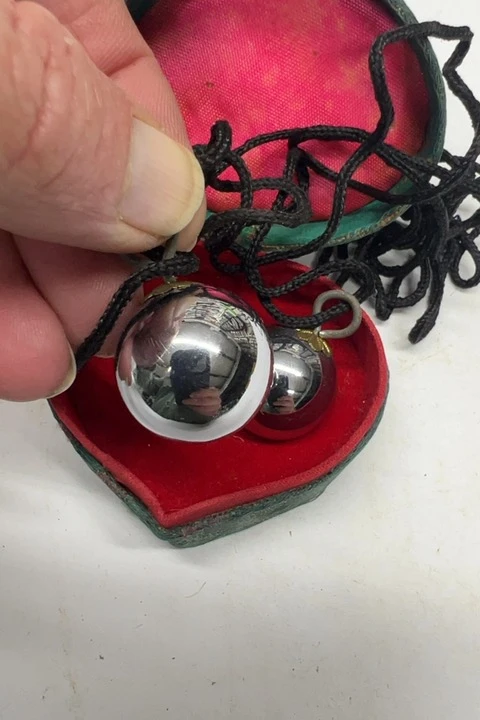 Chinese Baoding ball necklace set with chimes featuring silver balls, smooth / plain styling, and a green heart shaped box.