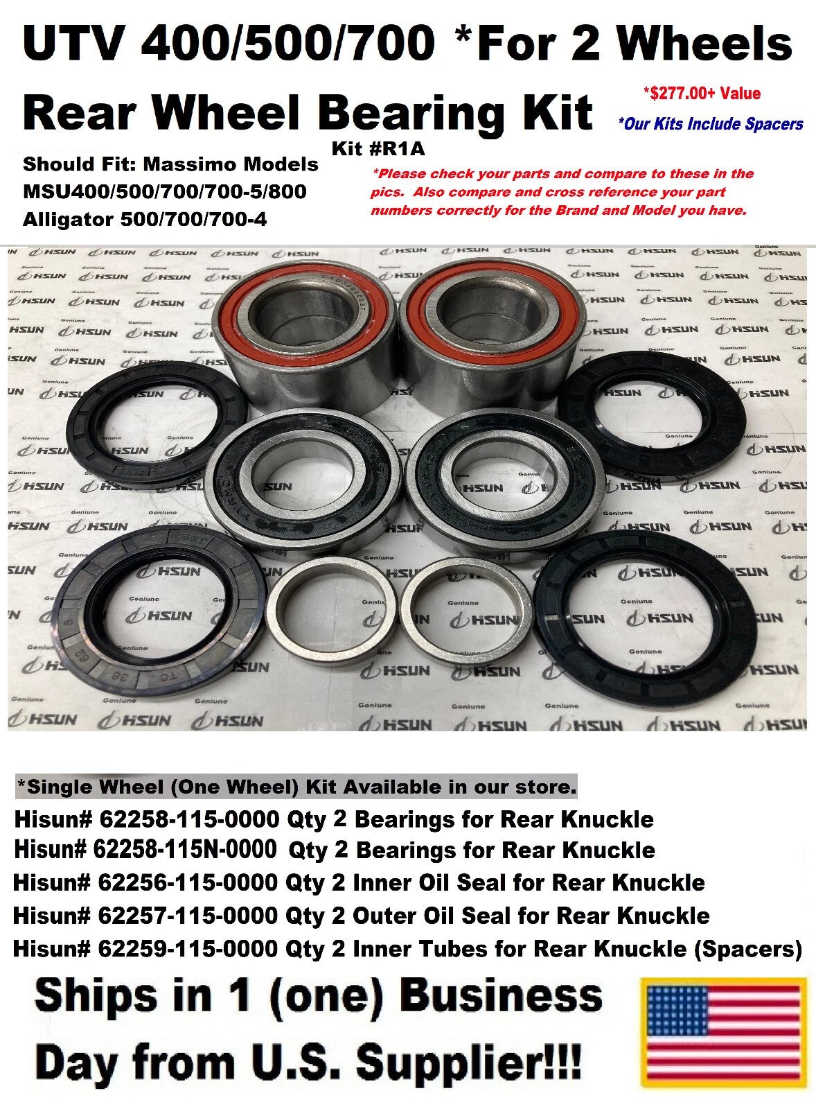 UTV REAR WHEEL BEARING KIT (FOR TWO WHEELS) #R1A – FITS SOME MASSIMO 400–800CC MODELS Condition: New MPN / OEM / Item Number: 62258-115-0000; 62258-115N-0000; 62256-115-0000; 62257-115-0000; 62259-115-0000 Country of Manufacture: China Rear