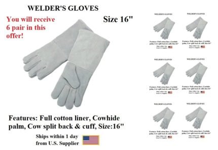 Set of six (6) pairs of heavy-duty welder’s gloves made from durable cow split leather with full cotton liners for comfort and insulation. Designed for welding, construction, farm work, and general-purpose use. Reinforced thumb, single-piece back design, and secure stitching provide excellent protection and grip.